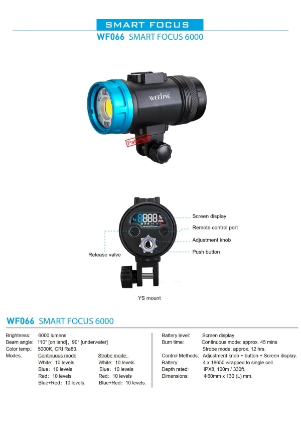 Weefine WF066 Smart Focus 6000-это светильник с удивительно большим количеством функций. Во-первых, это супер-Мощный светодиодный светильник с высококачественным COB светодиодный светильник, который производит естественный 6000-lumen луч. Светильник также включает в себя красный и синий светодиодный светильник для ночного и фтористого дайвинга. Во-вторых, все цвета на светильник можно использовать как Точечный светильник с функцией AFO. В этом режиме светильник зажигается, когда он распознает стробоскопический сигнал.
