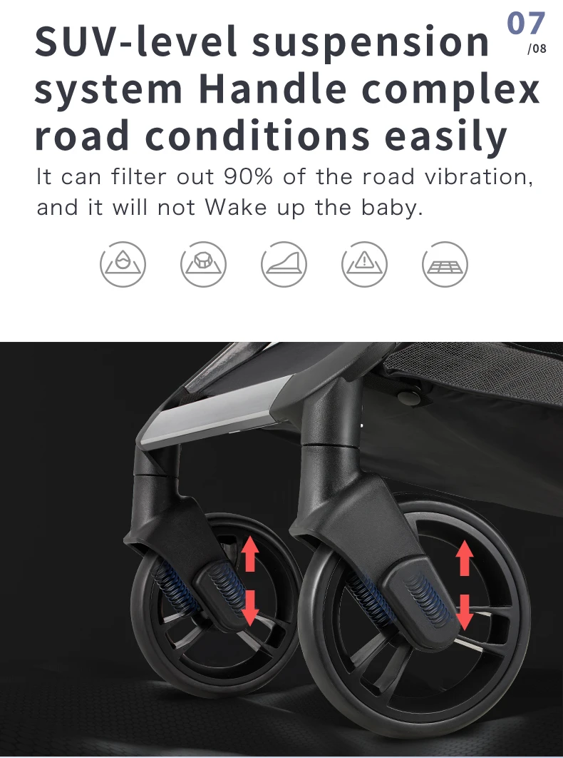 1. Поднимите ручку 2. Доступно на борту 3. Может сидеть и лежать 4. Четырехколесная подвеска