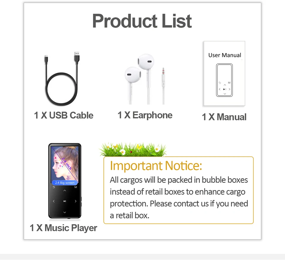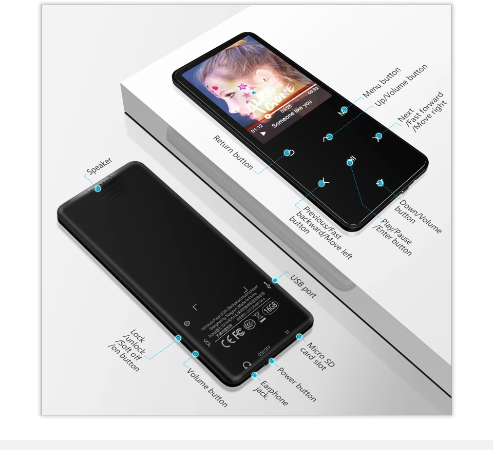 Посылка включает в себя: 1 x MP3 плеер 1 x USB кабель 1 x проводные наушники 1 x Руководство пользователя Обратите внимание, что проводные наушники будут отправлены в качестве бесплатного подарка, но они будут выбраны случайным образом, пожалуйста, имейте в виду, что они превалируют.