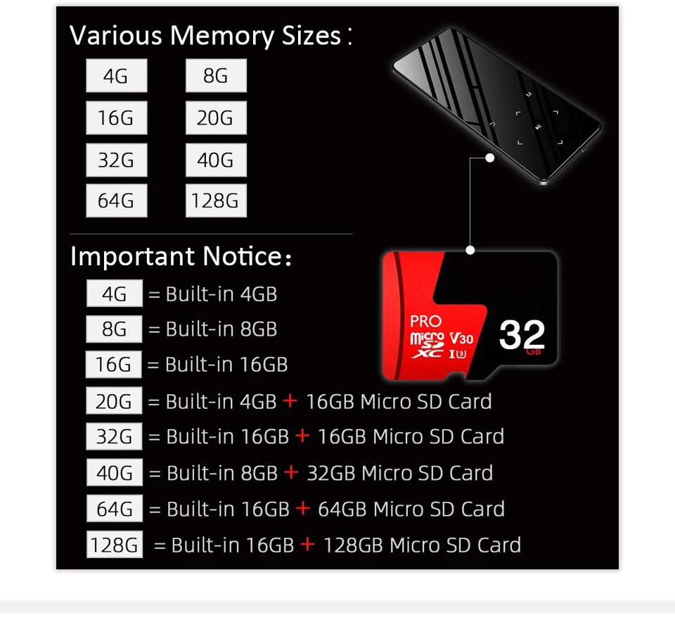 Есть 8 виды "Размер памяти». Некоторые из них уже использовали карту Micro SD. Чтобы избежать проблем с несовместимостью, Мы также рекомендуем вам купить у нас карты Micro SD. 4 ГБ означает, что Встроенный 4 Гб 8 ГБ означает, что встроенный 8 Гб 16 Гб означает, что встроенный 16 Гб Карта Micro SD, 20 ГБ, 4 Гб + 16 Гб 32 Гб означает, что встроенная карта Micro SD 16 Гб plus 16 Гб 40 ГБ означает, что встроенная карта Micro SD 8 Гб plus 32 Гб 64 Гб означает, что встроенная карта Micro SD 16 Гб plus 64 ГБ 128 ГБ означает, что встроенная карта Micro SD 16 Гб plus 128 ГБ