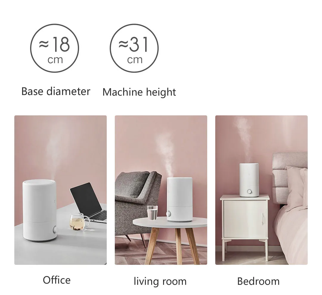 Диаметр верхней части увлажнителя Mijia составляет 14 см, открытый рот легко вытирается. Круглая и тонкая внутренняя структура уменьшает мертвый угол грязи и грязи. Резервуар для воды-это светильник, который легко переносить, что делает уборку более экономичной.