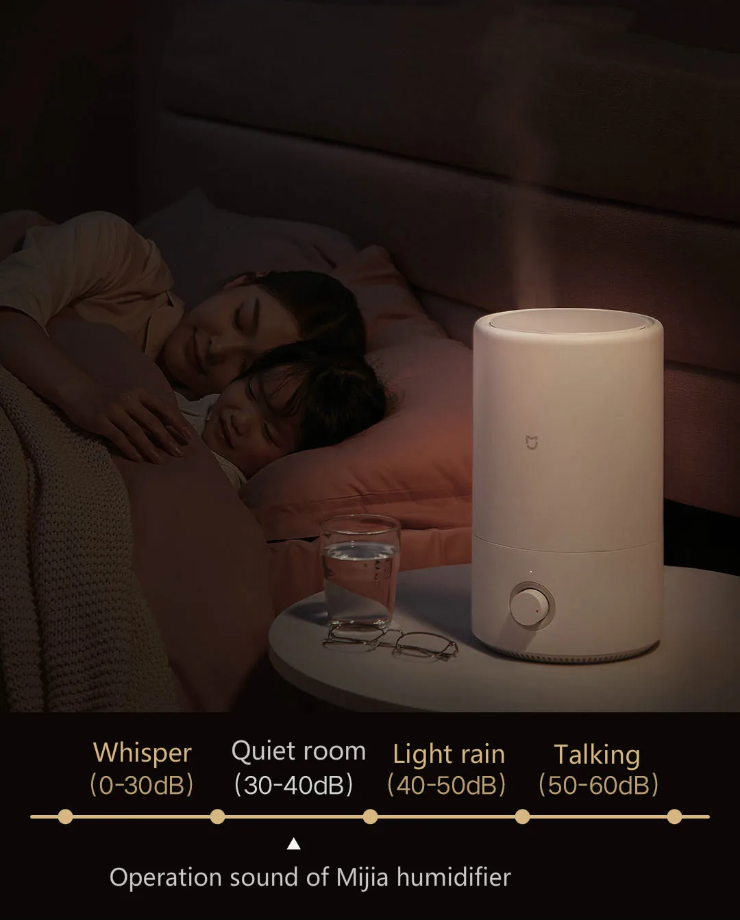 Увлажнитель Mijia уменьшает звук больших частиц потока водяного тумана и уменьшает шум вентилятора, а рабочий звук не превышает 38 дБ. Световой светильник мягкий и без Ореола, и он не ослепляет в темноте. Хорошо спите с низким уровнем шума, комфортно и увлажняет всю ночь.