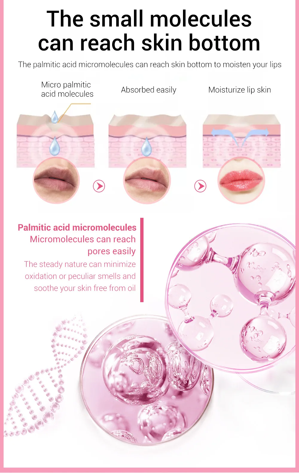 ▶Маленькие молекулы могут достигать нижней части кожи-микромолекулы пальмитовой кислоты могут достигать нижней части кожи, чтобы увлажнить губы.