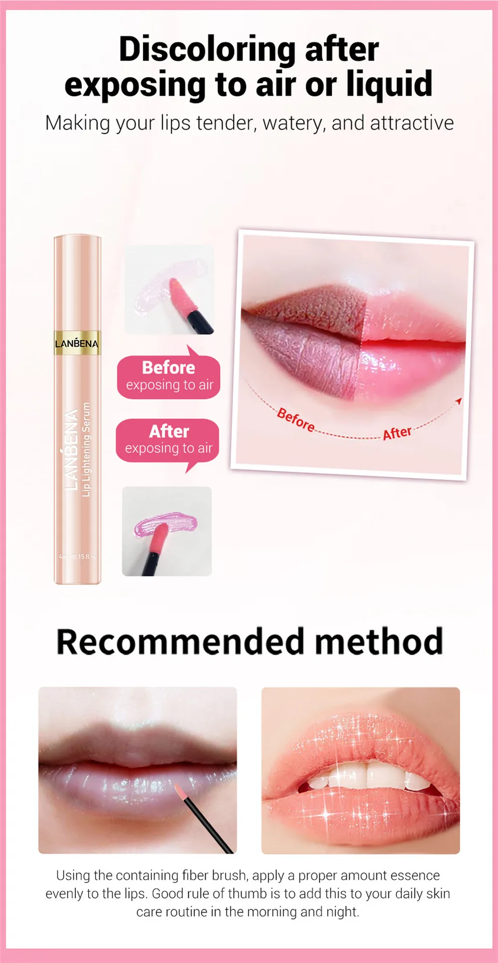 ★Рекомендуемый метод: используя содержащую щетку волокна, равномерно нанесите на губы необходимое количество эссенции. Хорошее правило, чтобы добавить это к вашей повседневной жизни по уходу за кожей утром и ночью.