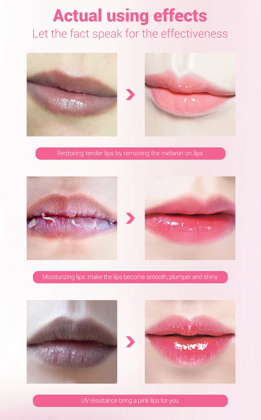 ▶Эффекты: уменьшение пигментации губ, увлажняющий слой на поверхности губ, блокирует влагу, делает губы гладкими, пышными и блестящими, придаст вам розовые губы.