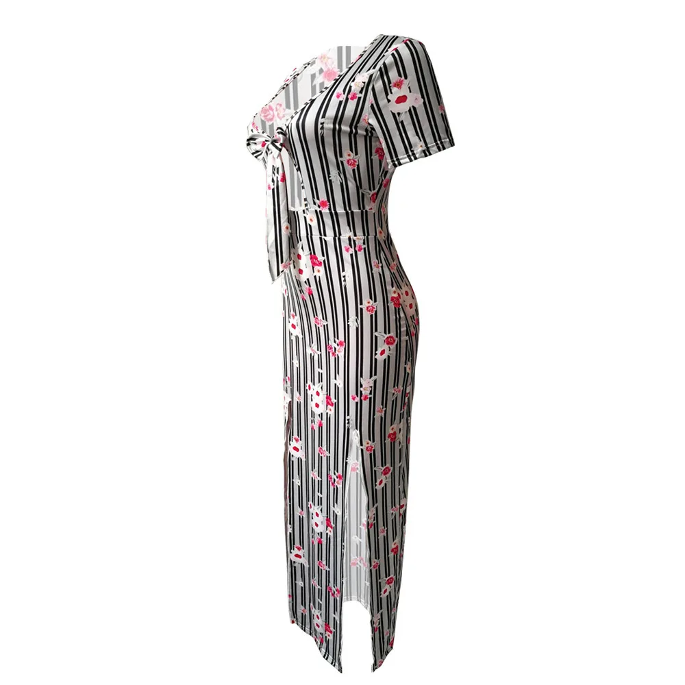 Dots Print Split Bodycon Dress Women Blue Cocktail Party Dresses Elegant Office High Waist Short Sleeve Summer Dress