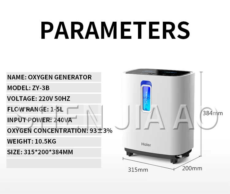 Название: генератор кислорода Модель: ZY-3B Напряжение: 220 В 50 Гц Диапазон потока: 1-5л Входная мощность: 240ва Содержание кислорода: 93 ± 3% Вес: 10,5 кг Размер: 315*200*384 мм