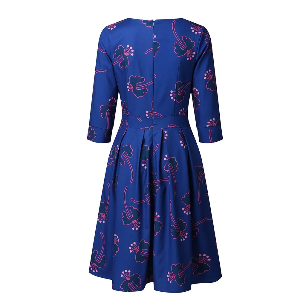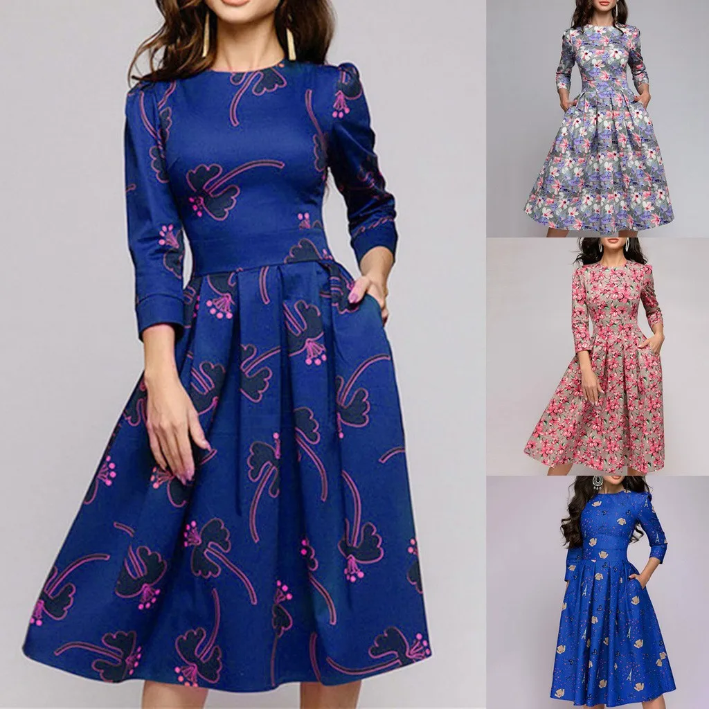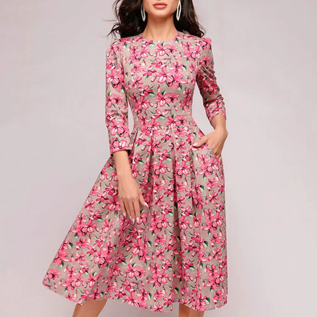 Винтажное платье женское модное Цветочное платье с круглым вырезом и рукавом 3/4 с карманом на молнии большие качели Плиссированное ретро платье Хепберн