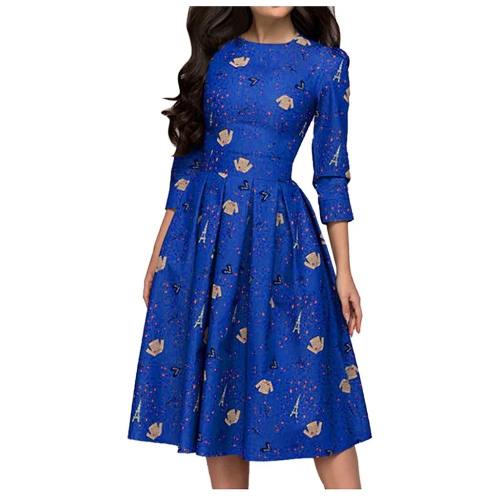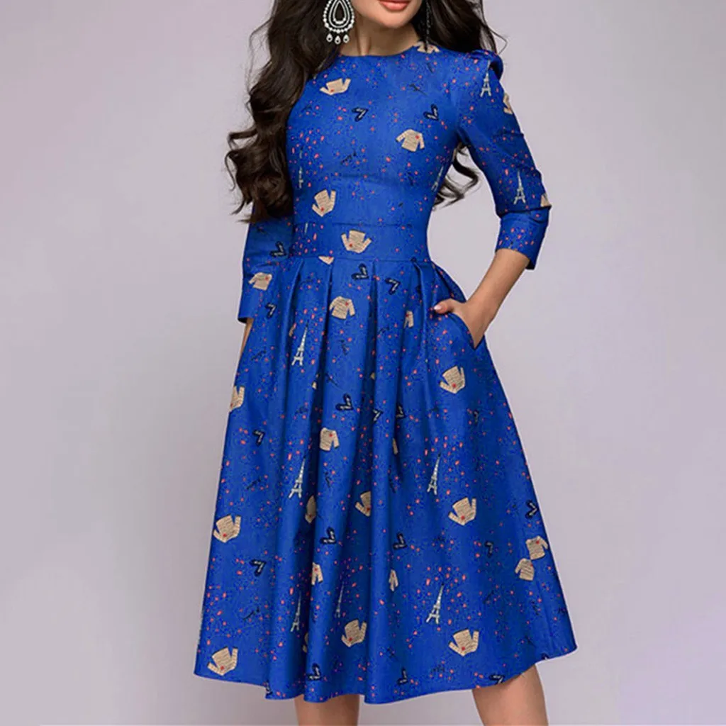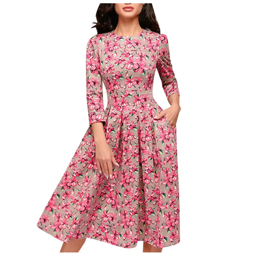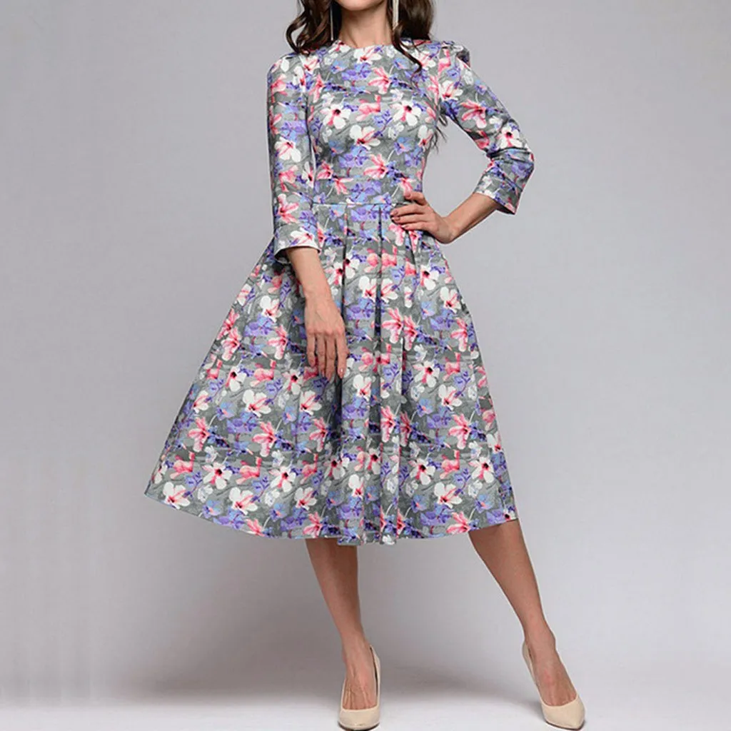 Винтажное платье женское модное Цветочное платье с круглым вырезом и рукавом 3/4 с карманом на молнии большие качели Плиссированное ретро платье Хепберн
