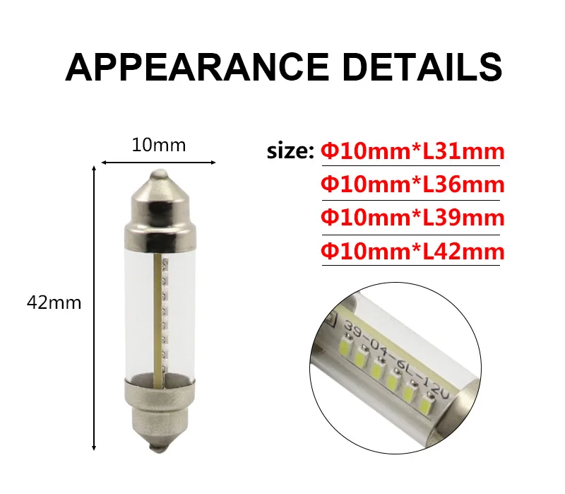【Модель изделия: ZSSJ10-468L 【Мощность: 0,5 Вт/0,7 Вт/1 Вт 【Световой поток: 40 лм/60 лм/80 лм (белый) 【Освещение: угол 120 градусов 【Световое покрытие 】: трубка из поликарбоната 【LEDs】:SMD3014 светодиоды 【Ra】:≥ 80 【Напряжение: 6VDC/12VDC/24VDC/48VDC 【Основание: SV8.5 【Светодиодный срок службы: 30000 часов 【Цвет светодиодов: белый/теплый белый 【Размер лампы 】: D10 * L31/36/39/42 мм.