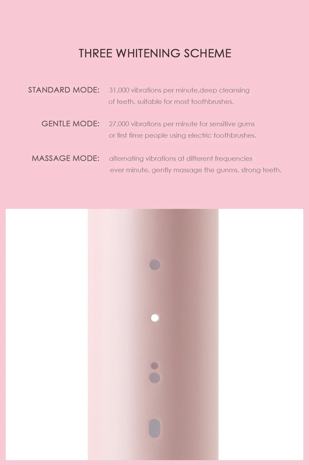 ● Так белая электрическая зубная щетка может достигать 31000 вибраций в минуту, что не только может очищать поверхность зуба с высокой эффективностью, но также может образовывать звуковую волну потока чистящей силы, глубокий угол чистки, глубокая чистка зубов.