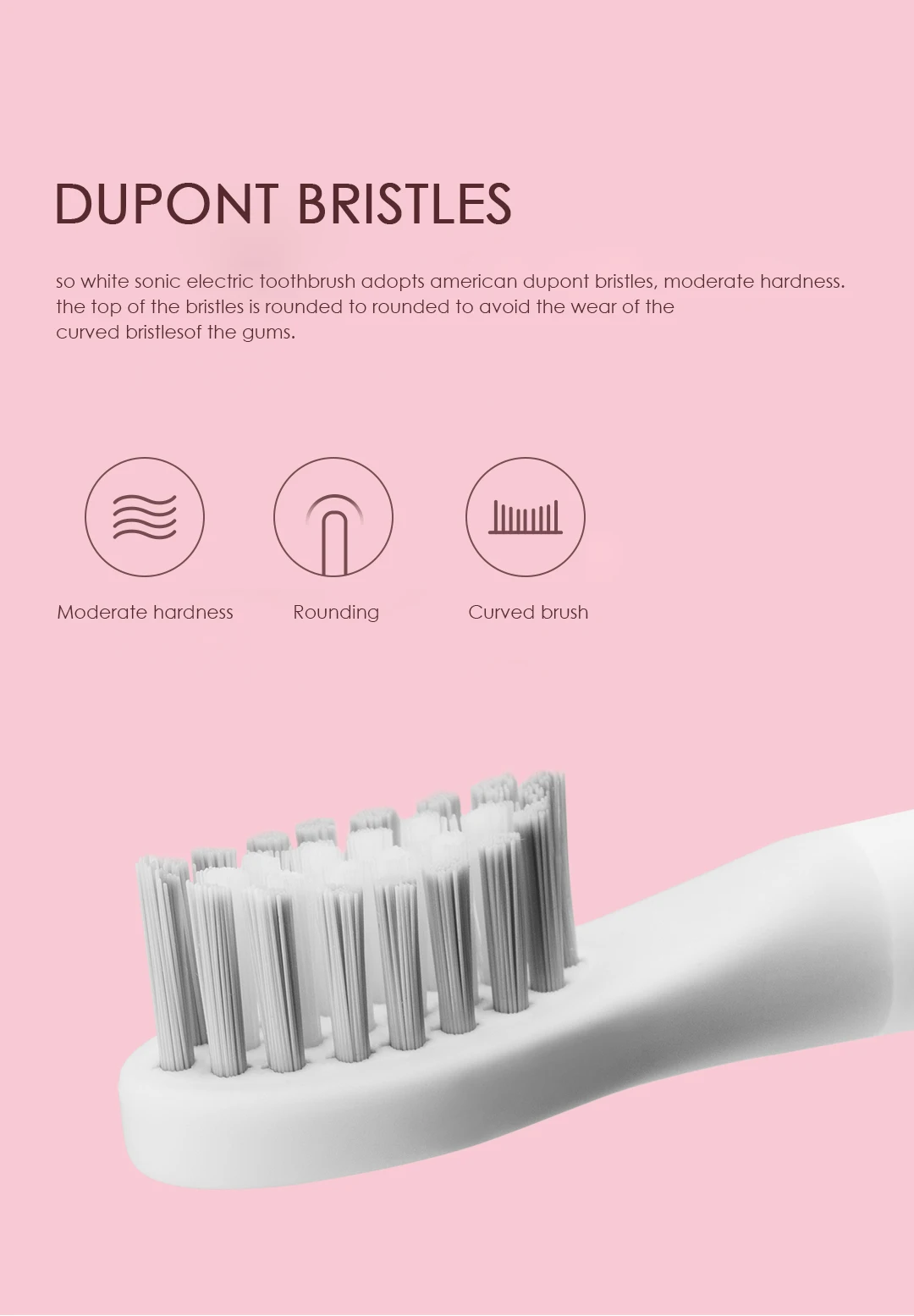 ● Белая электрическая зубная щетка sonic принимает американские щетинки DuPont, умеренная твердость, а верх щетины округлый и гладкий, чтобы предотвратить истирание десен.