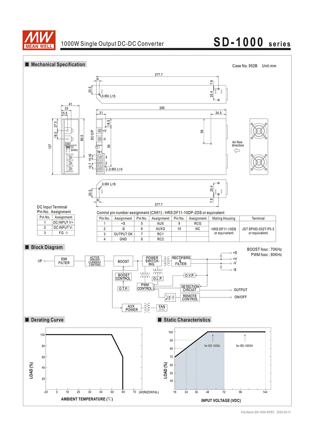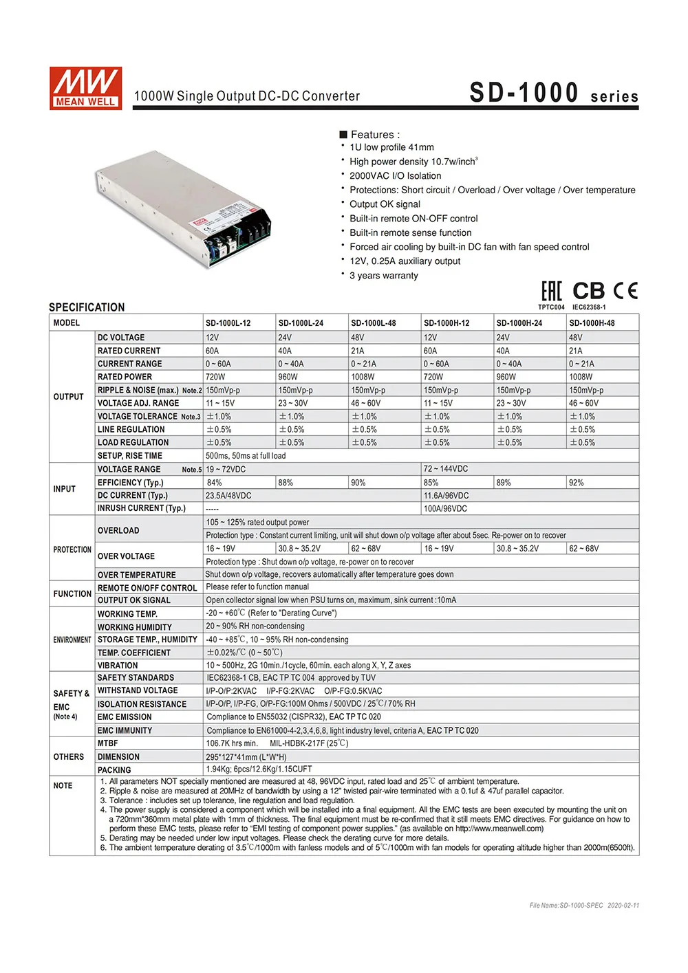 1U low profile 41mm High power density 10.7w/inch3 Protections: Short circuit / Over voltage/Overload/Over temperature 2000VAC I/O isolation Output OK signal Built-in remote ON-OFF control Built-in remote sense function Forced air cooling by built-in DC fan with fan speed control 12V 0.25A auxiliary output 3 years warranty