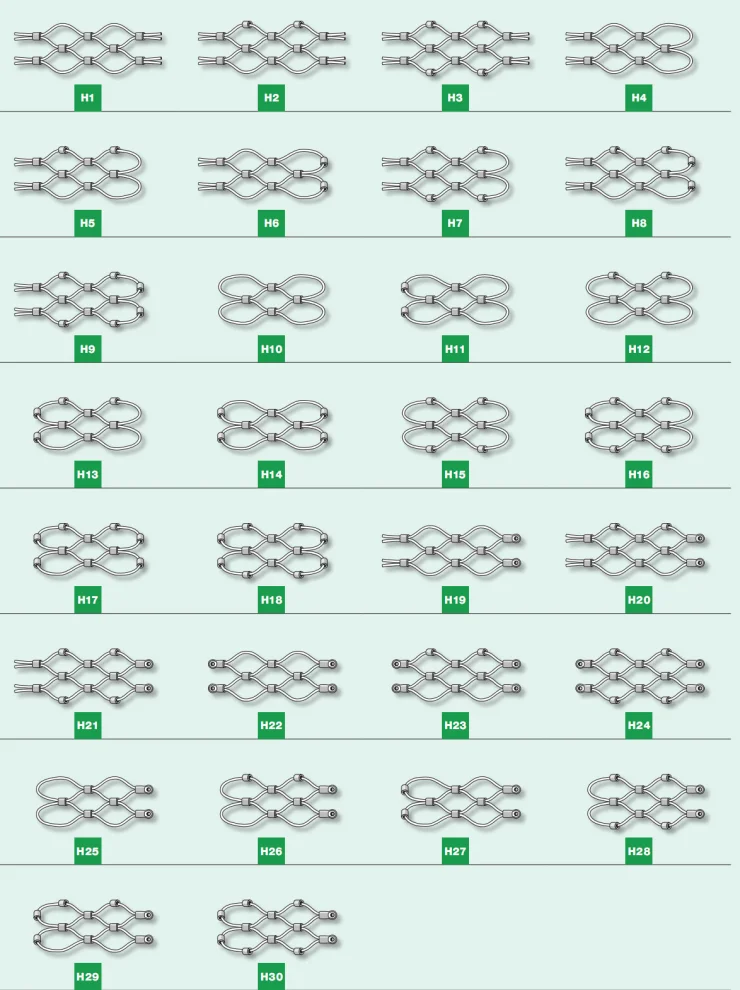 Материал: нержавеющая сталь 304, 304L, 316, 316L (материал импортируется из Южной Кореи и Японии). Структура кабеля: 7x7 и 7x19. Диаметр кабеля: 1/8 ", 3/32", 1/16 "и 3/64". Размер сетки: 1 "x 1", 1-1/2 "x1-1/2", 2 "x 2", 3 "x 3", и 4 "x4