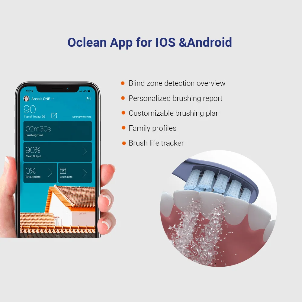 Oclean App for IOS &Android Blind zone detection overview Personalized brushing report Customizable brushing plan Family profiles Brush life tracker Supported languages: Chinese, English, Spanish, Russian, German, French, Italian, Turkish, Polish, Japanese, Korean, Arabic