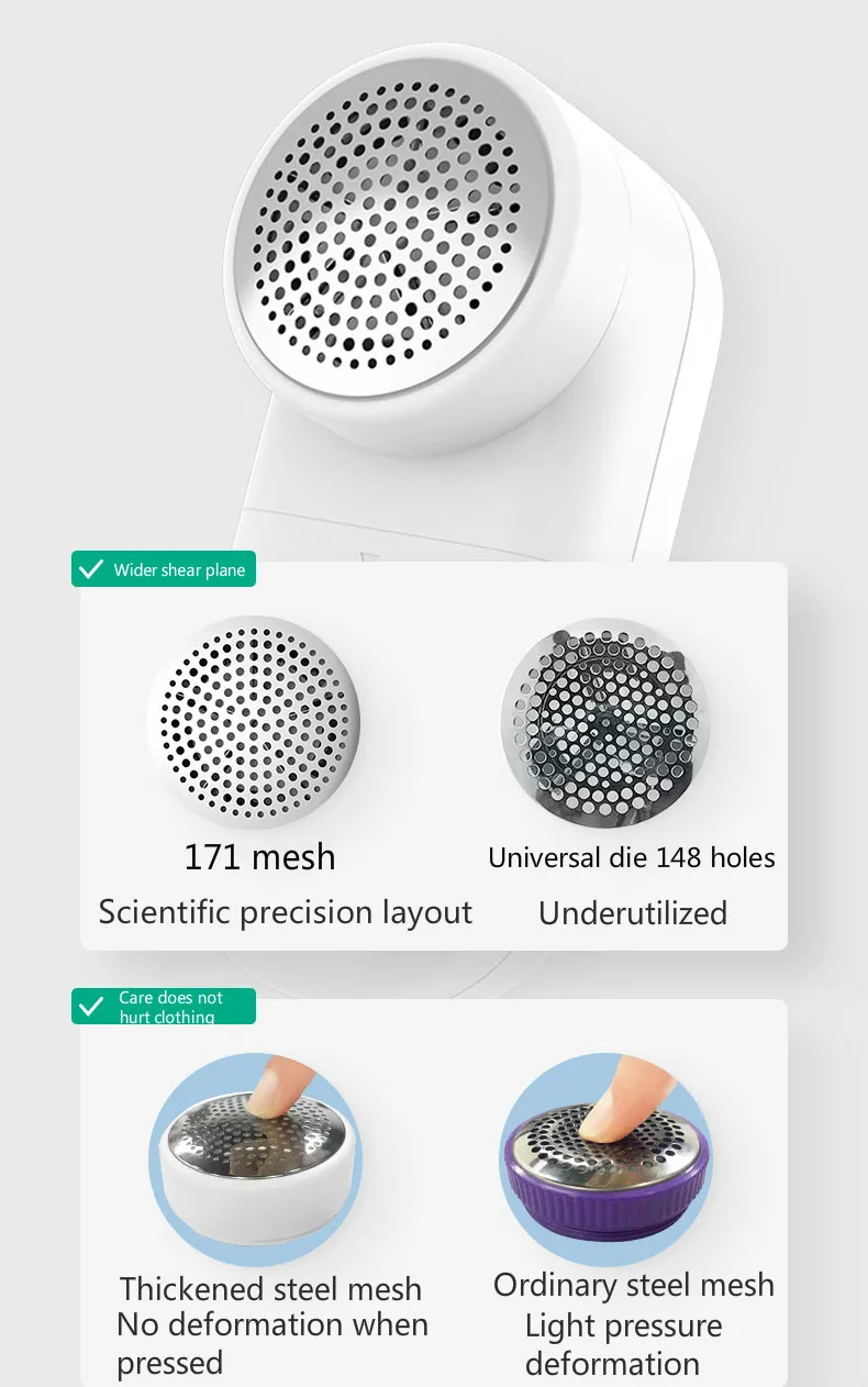 Неровные плавающие лезвия из нержавеющей стали, чтобы избежать помех и отскока Плавающее интегрированное лезвие без отверстия предотвращает попадание волосяного шара в лезвие и не отскочит, что приведет к повреждению одежды. Действительно Отрегулируйте ширину лезвия вверх и вниз автоматически в соответствии с размером шарика для волос, и защитная одежда не повредит одежду. Лезвия из нержавеющей стали с пятью листьями эффективно режут шарики для волос.