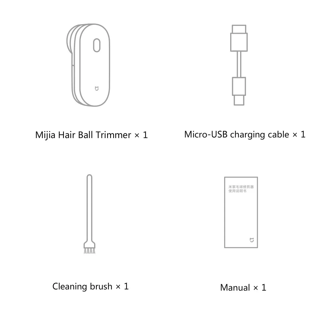 Модель продукта: MQXJQ01KL Вес нетто: 213 г Размер изделия: 145 × 62 × 65 мм Цвет изделия: белый Входной параметр: 5V-1A Номинальное напряжение: DC3.7V Номинальная мощность: 2 Вт Комплектация: триммер для меховых шариков Mijia × 1, зарядный кабель Micro-USB × 1, щетка для чистки × 1, руководство по эксплуатации × 1
