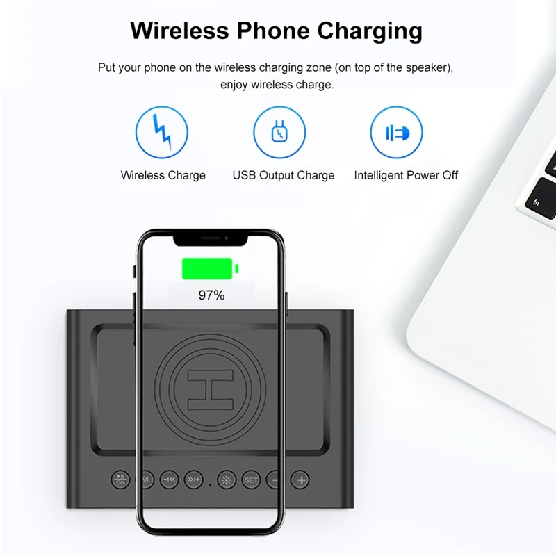 (Wireless Phone Charging)On the top of this speaker, it has a wireless charging sensing zone, put your phone that support Qi standard, it can be charged by this speaker.
