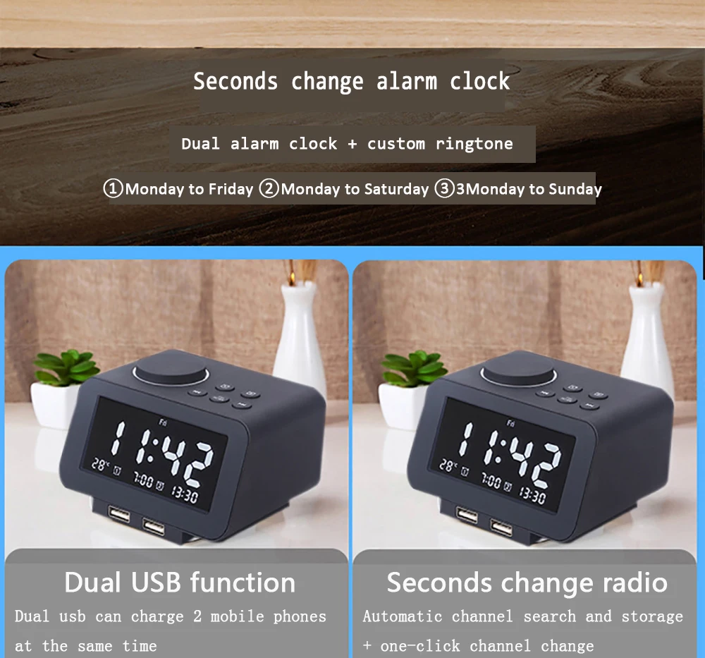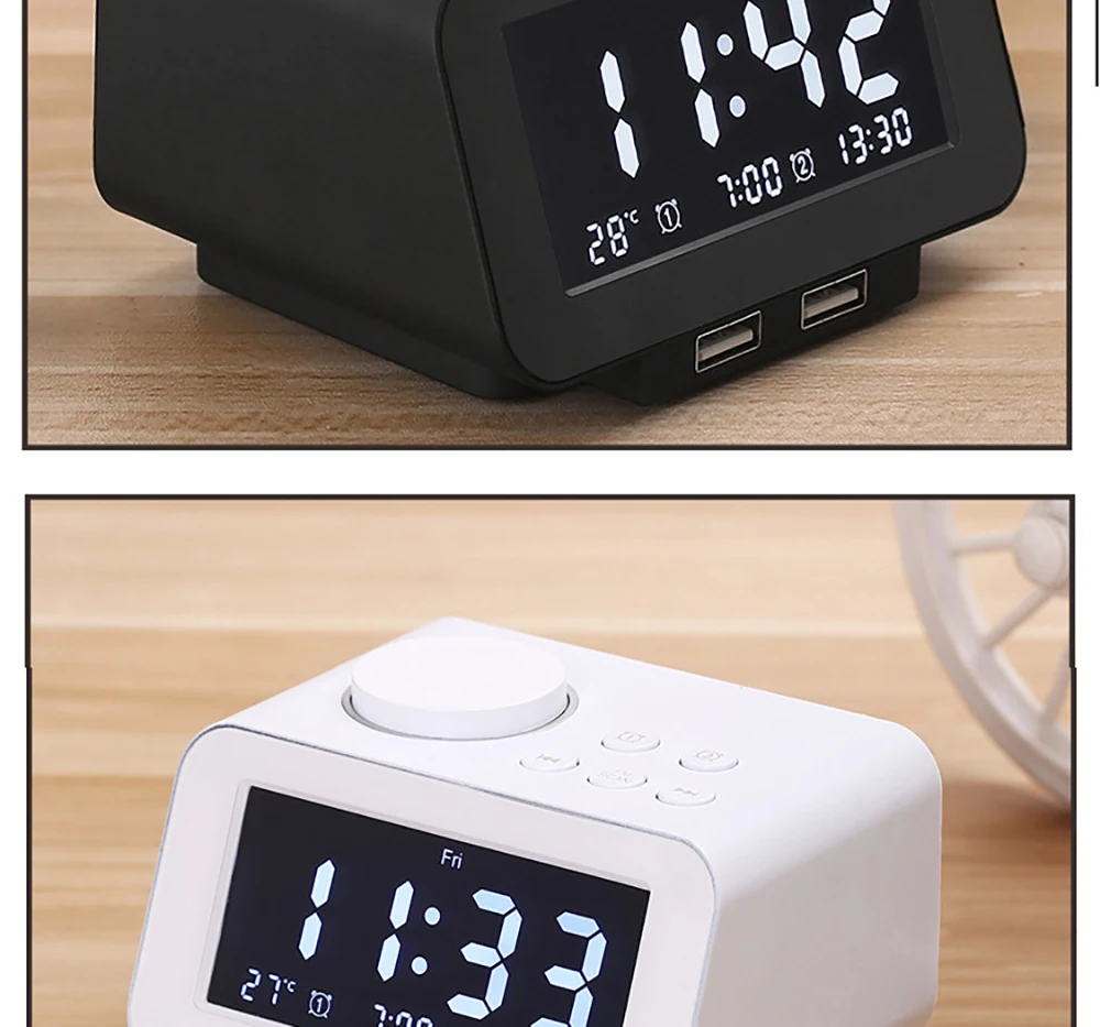 Особенности: 1. Часы с ЖК-дисплеем, подсветка белого цвета (можно переключать 12/24 часов); 2. Функция будильника, двойная Настройка будильника, будильник может выбрать Встроенный и ослепляющий мелодию звонка И FM, можно регулировать размер мелодии звонка; 3. Регулируемая яркость подсветки, регулируемая яркость подсветки (всего 5 уровней), или выключить Подсветка; 4. При звуке будильника нажмите кнопку повтора; 5. Функция отображения температуры, встроенный модуль датчика температуры, может отображать внешнее окружающее Температура в реальном времени (по Цельсию/по Фаренгейту можно переключить); 6. Двойной выход USB, выход 1.1A / 2.1A, который может заряжать iPhone и iPad через Два USB одновременно 7, PLL электронная регулировка fm-радио Функция: приемная частота 87,5-108 МГц; 8. Полноразмерный большой (82*40mmTN отрицательный дисплей) ЖК-дисплей часы и различные рабочие состояния; 9. Резервный источник питания часов: 3 батарейки AAA (стандарт без этого Аккумулятор) Посылка включает: 1 * Светодиодный дисплей двойной будильник fm-радио беспроводной bluetooth динамик 1 * зарядный кабель 1 * руководство на английском языке