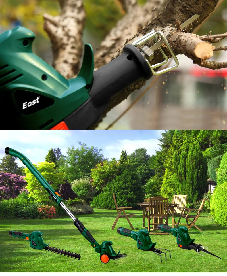 1 x садовый культиватор/триммер для травы/триммер для изгороди/Садовая пила 1 x ручка и колеса 1 х Аккумулятор (литий-ионный) 1 зарядное устройство и зарядная станция (VDE) Руководство пользователя (на английском языке)-1 шт.