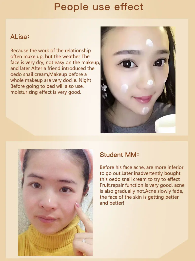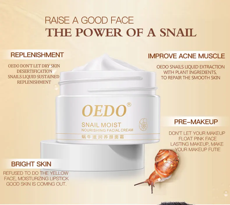 Содержит эссенцию экстракта улитки, ее текстура мягкая и влажная с нежным и мягким ощущением на ощупь и легко впитывается кожей. Это может помочь улучшить тусклую кожу, которая восполняет влагу и питание для защиты сухой и грубой кожи. Борясь с морщинами и укрепляя нежную кожу, она также сохранит уровень влаги кожи, оставляя ее влажной и гладкой с молодой блестящей.