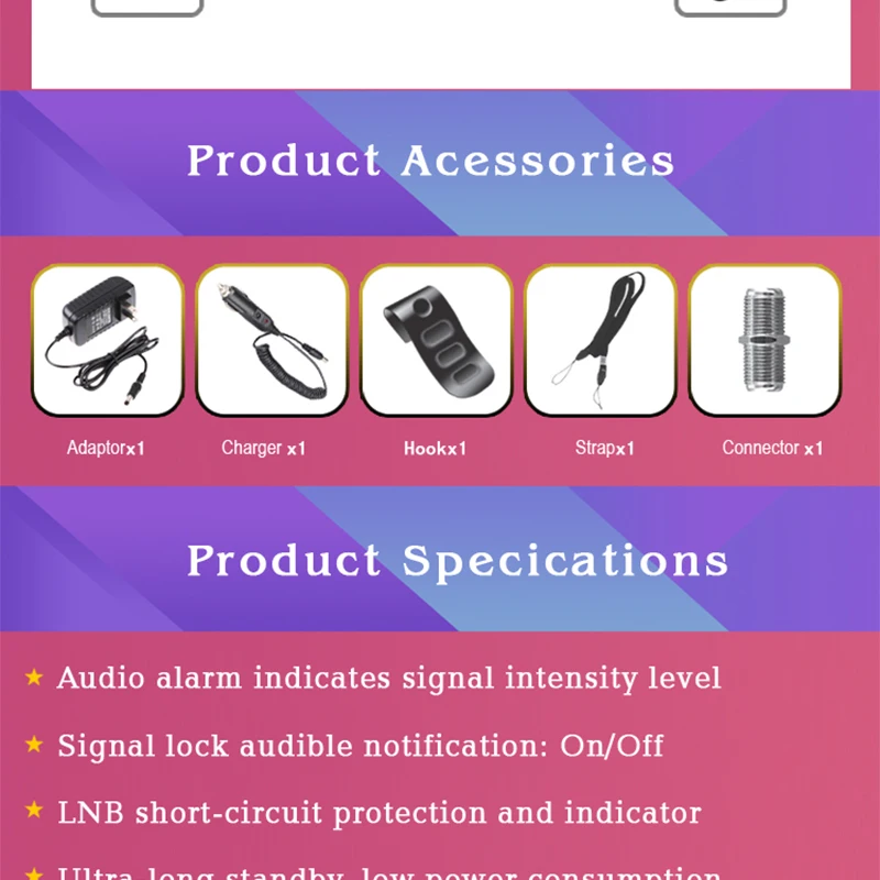 Звуковой сигнал показывает уровень интенсивности сигнала Звуковой сигнал блокировки: вкл/выкл LNB защита от короткого замыкания и индикатор Сверхдлительный режим ожидания, низкое энергопотребление Источник питания: 12 В 100 мА Быстрая зарядка литий-ионная батарея может быстро около 5 часов Вход сопротивление: 75Ω Мощность ток на выходе: 13/18 в, 350mA Выбор KU/C-Band Графический и цифровой интуитивно понятный дисплей Освещенная контржурным светом keyscar зарядное устройство Работа с SCR/DCSS LNB Минимальный уровень:-35 дбув (шум) Макс. Уровень в: ~ 90dBuV Качество сигнала в процентах С компасом Поддержка петля функция поиска Поддержка спектров Поддержка специального инструмента findsat для TP Edit/Satellite list Поддержка автоматического пробуждения батареи сна
