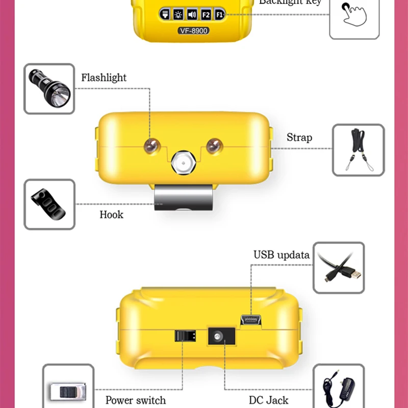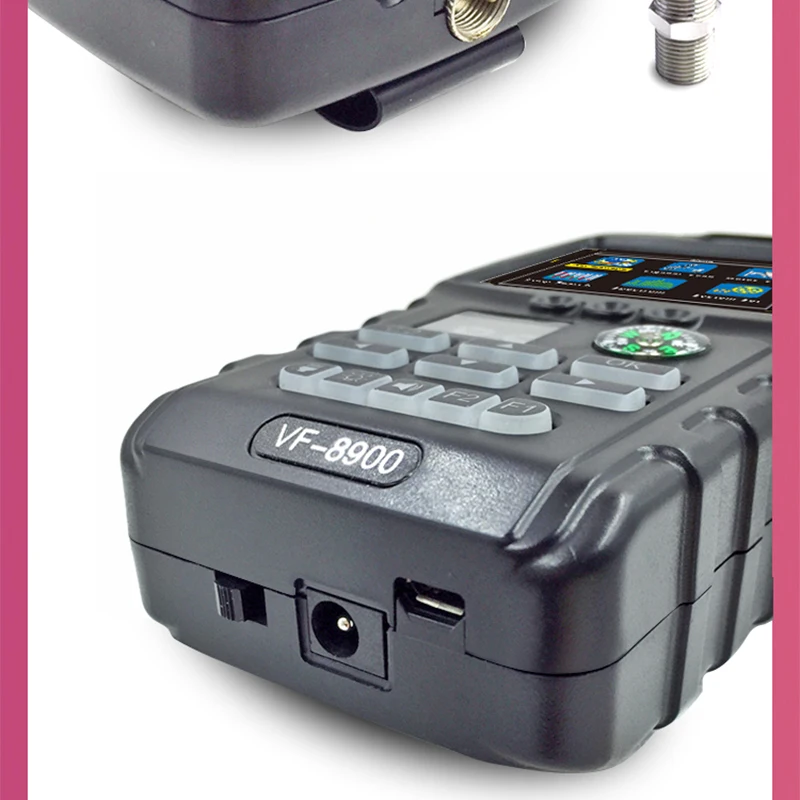 Модель VF-8900 Дисплей 2,4 "TFT ЖК-дисплей Вход сопротивление 75Ω Диапазон частот 950 ~ 2150 МГц Одноуровневый (-25 дБм ~-65дбм) LNB Питание 12/18V,350mA LNB переключатель управления 22 кГц Демодуляции чип M88DS3103B Процессор 8 бит MCU Литиевая батарея: 7,4 В/1400 мАч