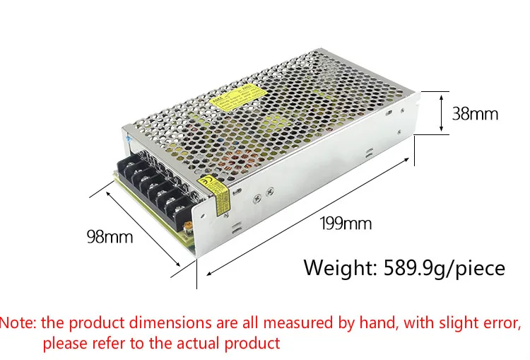 Параметры продукта Название: импульсный источник питания Модель: s-100-12 (24) Номинальный ток: 8.5a/4.5a Диапазон тока: 0 ~ 8.5a/4.5a Рабочая температура:-10 ~ + 60 ℃ Вес: 589,6 г Напряжение постоянного тока: 12 В/24 В Выходная мощность: 102 / 108 ВТ Диапазон частот: 47 ~ 63 Гц Пульсация и шум: 100mvp-p Количество посылка: 1/коробка Примечание: все размеры изделия измеряются вручную, с небольшой погрешностью, пожалуйста, обратитесь к фактическому продукту