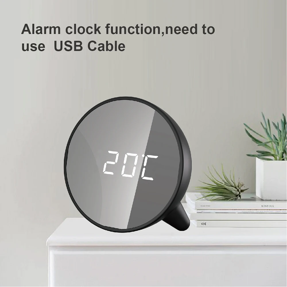 LED screen with mirror surface shows clear and distinct time for you. Mirror alarm clock with stylish appearance is not only perfect for home decor, but also can be used as a mirror when you need. There is a high/medium/low option to set the led brightness to your own personal confort level. Wake up on time with help from this digital alarm clock.Repeating snooze function makes it possible to sleep a little longer. It can be powered by USB cable ( included ) and AAA batteries ( not included).both of them are easily available. Features time ,date,temperature.it makes a practical choice for use in your bedroom nightstand,office desk,dorm room and more. Round alarm clock won't take up much room on your nightstand.