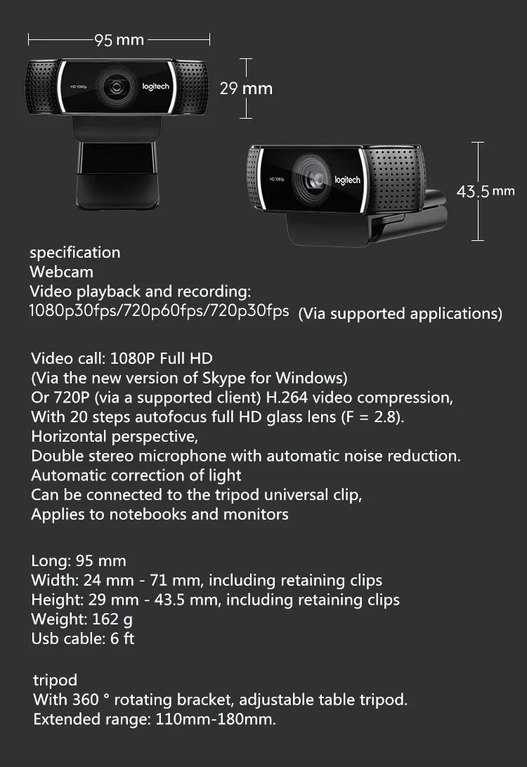 Технические характеристики и детали Спецификация Без фиксированного зажима: Высота x Ширина x глубина: 29 мм x 95 мм x 24 мм С зажимом: Высота x Ширина x глубина: 44 мм x 95 мм x 71 мм Вес (с фиксирующим зажимом и соединительным проводом): 162 грамма Длина линии: 1,8 метра Системные требования Совместимость Windows®7, Windows 8 или Windows 10 Mac OS X 10,9 или более поздних версий Хромовая ОС™ Android™V5.0 или выше Usb-порт Для получения точной информации по системе и требованиям к производительности, пожалуйста, посетите веб-сайт вашего популярного поставщика решений для доставки видео. Технические характеристики Применяется для XSplit OBS Содержимое упаковки продукта Веб-камера