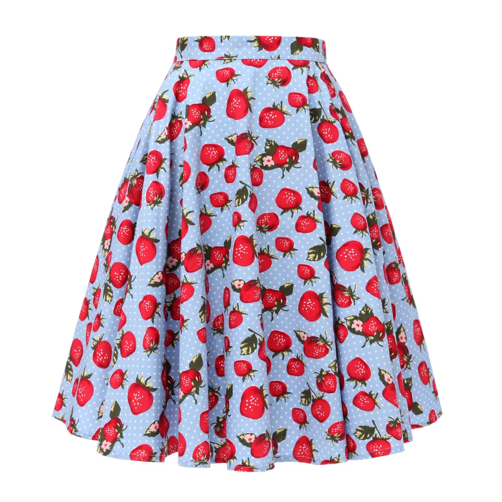Летняя юбка в горошек с рисунком клубники SP0677 Ретро винтажная юбка рокабилли 50s размера плюс, Хлопковая женская юбка синего цвета