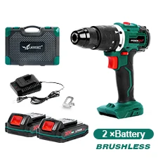 20V Lithium-Ion Brushless cordless drillPOSENPRO PCCD20 Brushless cordless drill,All-metal gears and 1/2" key-less ratcheting chuck provide maximum durability and great accessory compatibility; F/R button and variable speed trigger are available for drilling and fastening.20V 2000mAh large capacity Lithium-Ion batteries with power indicator.Powerful BRUSHLESS motor delivers 50Nm peak torque; 19+1 position clutch generates 150% precision of torque adjustment than regular 16+1 drill/driver; 2 speed transmission (0 - 400 & 0 - 1400 RPM) for a range of drilling holes and driving screws on wood, metal and plastic.Rubber over-mold handle with ergonomic design offers maximum user comfort and less vibration; Trigger-activated LED light illuminates your work area.①