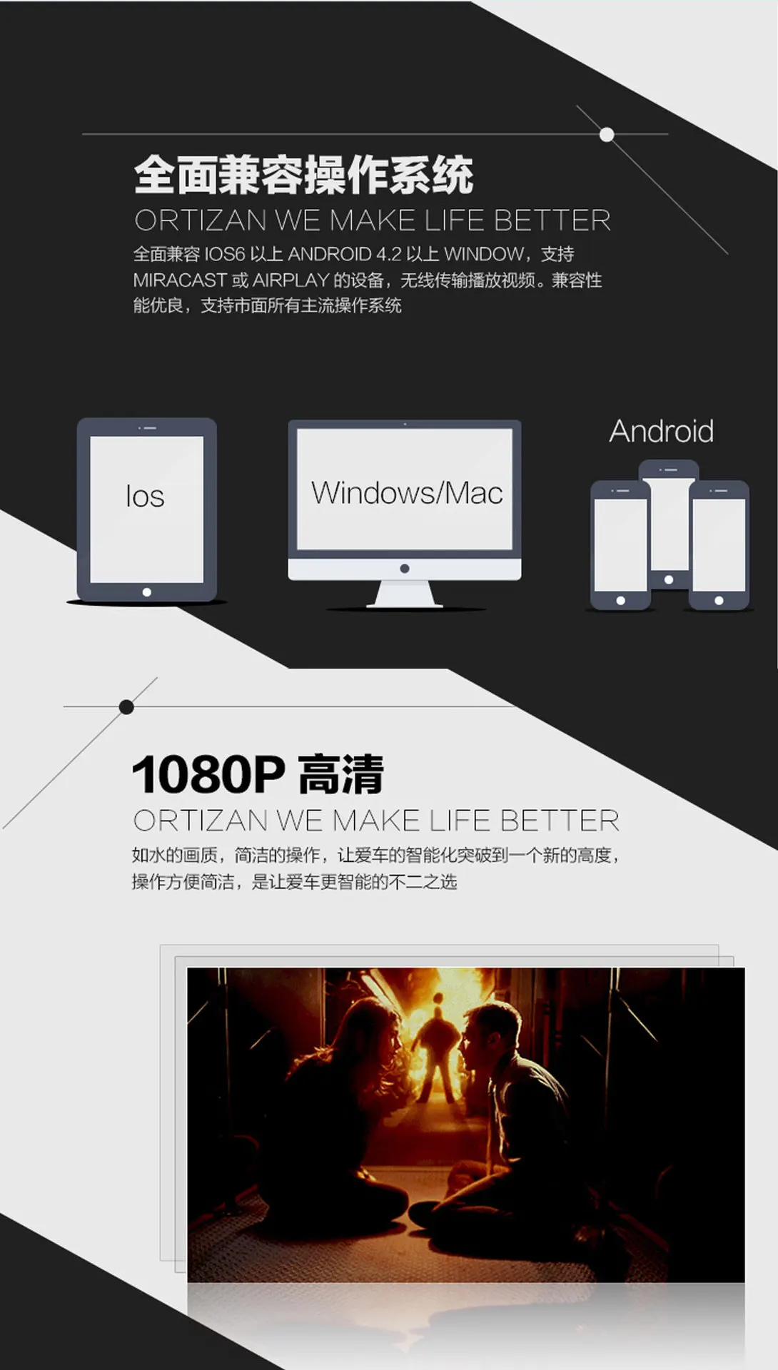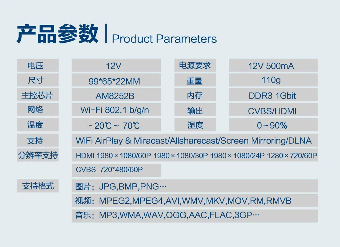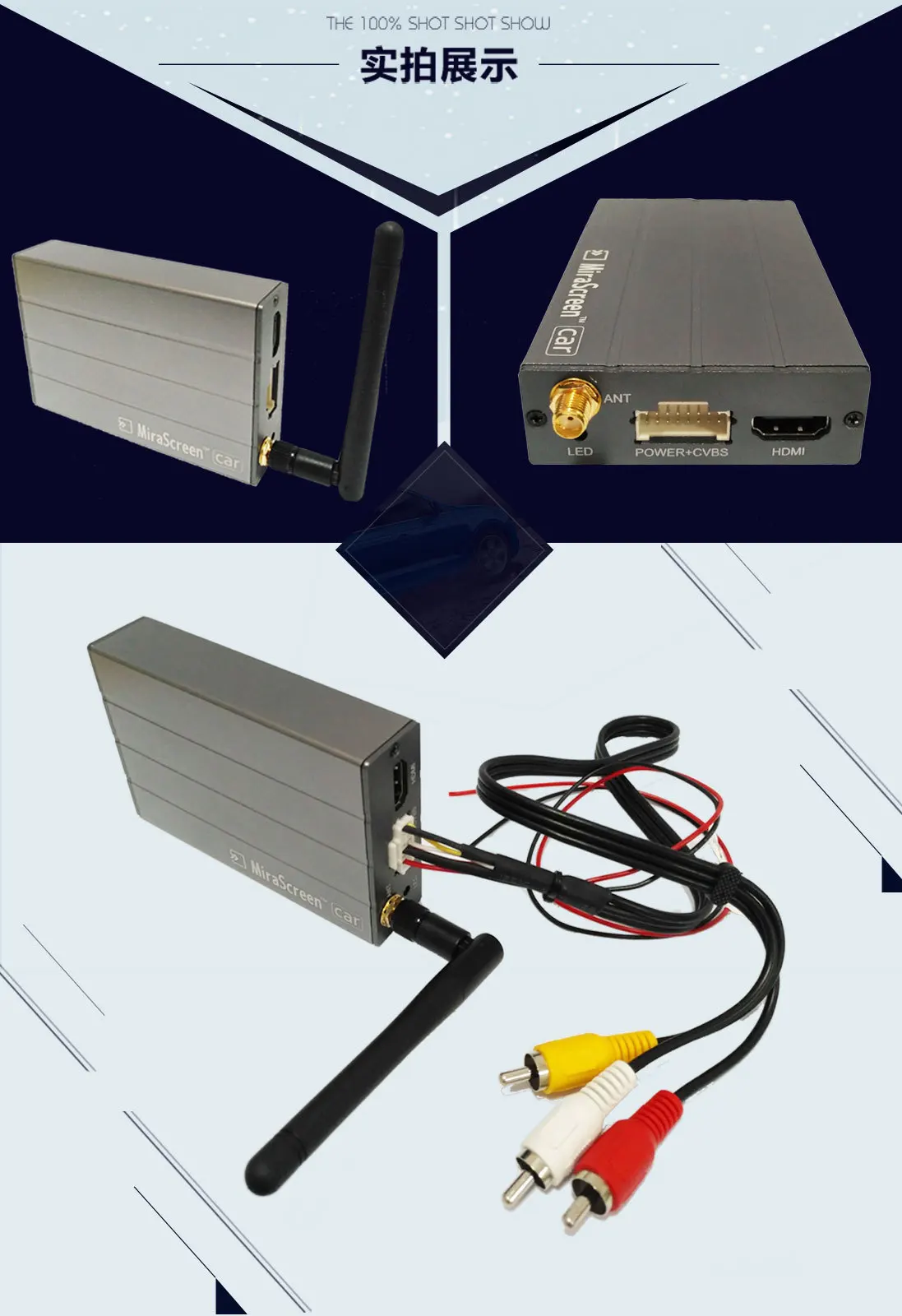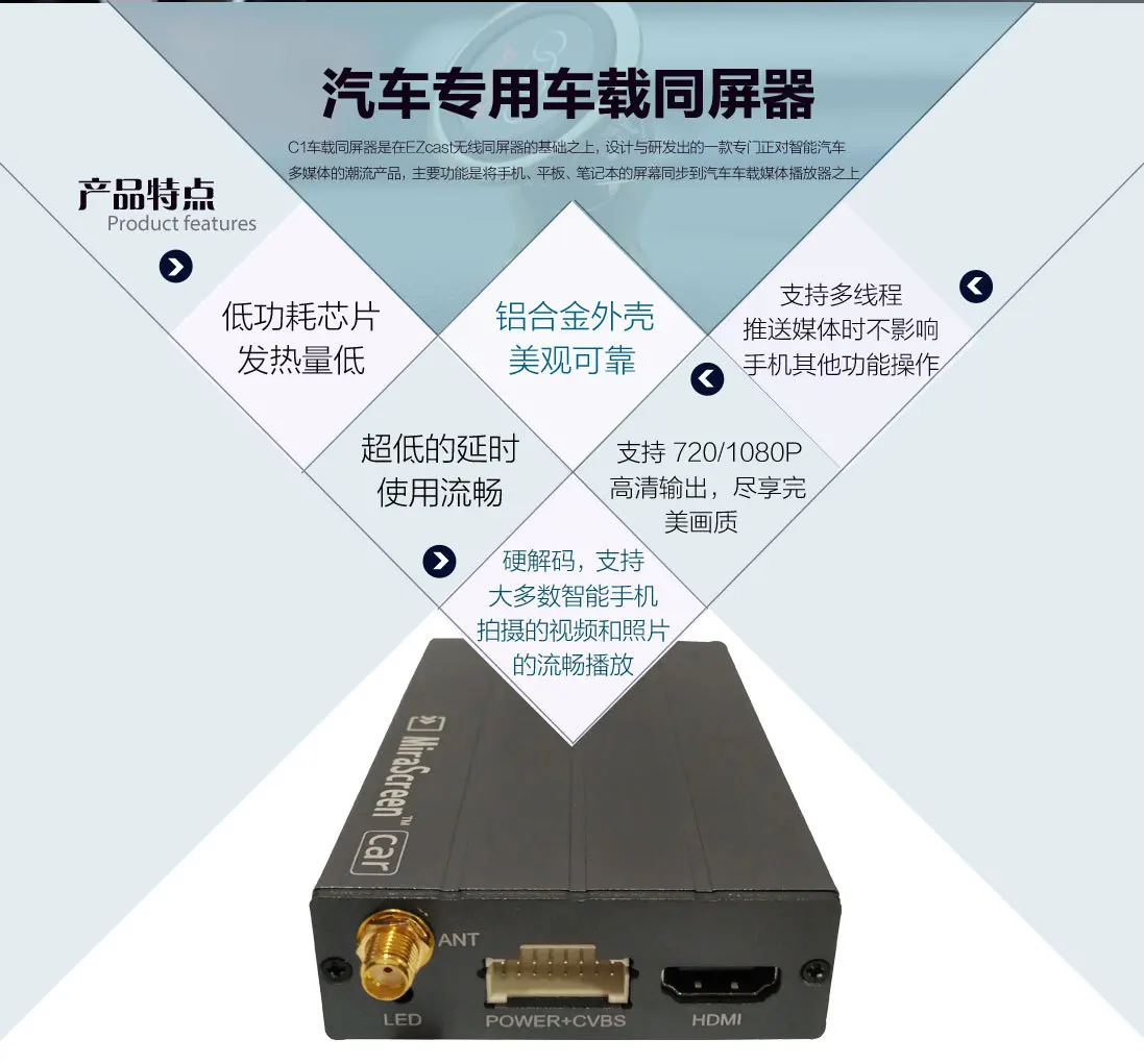 Main Features: - Low-power chips, low calorific value - Aluminum alloy shell, strong and durable - Ultra low latency, fluent use - Support multitasking, stream media without affecting any other operation of mobile phone - Support WiFi 802.11 b / g / n standards - Support Miracast / DLNA / Ezcast transmission protocol Brand: MiraScreen Connectors: HDMI Decode Ability: 1080P (Full-HD),720P (HD) Type: High Definition Package weight: 0.252 kg Product Size(L x W x H): 10.00 x 6.50 x 2.20 cm / 3.94 x 2.56 x 0.87 inches Package Size(L x W x H): 13.50 x 9.30 x 5.00 cm / 5.31 x 3.66 x 1.97 inches Package Contents: 1 x MiraScreen C1 Car Multimedia Display Dongle, 1 x Bilingual User Manual in English and Chinese, 1 x AV Cable, 1 x Connective Cable, 1 x Antenna