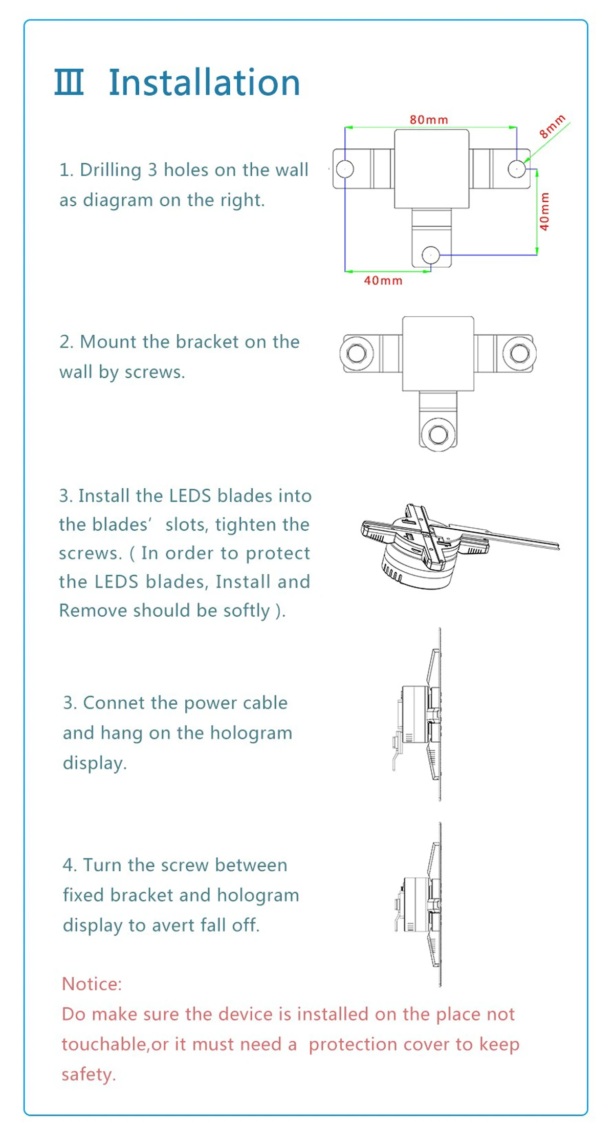 Особенности: ① 3D стерео, голограмма, повышают внимание, повышают визуальное воздействие 3D. ②Воспроизведение карты памяти или Wi-Fi, содержимое можно заменить на мобильный телефон ③ Малый размер, легко носить с собой, легко установить, широкий спектр вариантов использования. ④Изображение четкое, и его легко заменить рекламный контент. Он поддерживает обычные изображения, анимацию и изображение. Applicable применяется в кинотеатрах, аэропортах, торговых центрах, метро, городских рекламных объявлениях, дорожных знаках, выставках и других местах. Vivid яркий голографический дисплей продукта, динамический дисплей деталей продукта легко определить, подходит для информации о продукте подсказок и приложений.