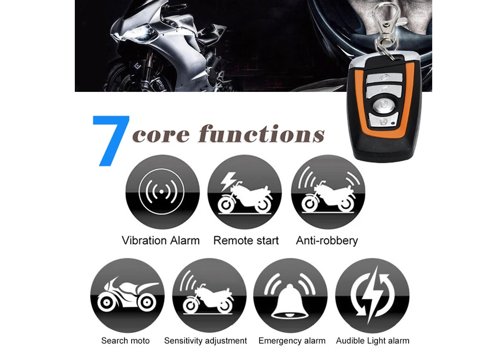 REmote start engine,Auto-Arm (если вы забудете заблокировать свой мотоцикл)Дистанционная остановка, противокражная защита и защита от захватаСигнал тревоги, направленный свет мигаетRУправление эмотией и хост являются водонепроницаемымиSEarch транспортных средств, Шесть звуков окружающего, звук и свет охранной сигнализации5-уровневая дистанционная регулировка чувствительностиУльтра-низкое энергопотребление, предотвращает потерю заряда батареиЗащита от обрезкиИспользуйте динамический пароль, чтобы предотвратить репликацию