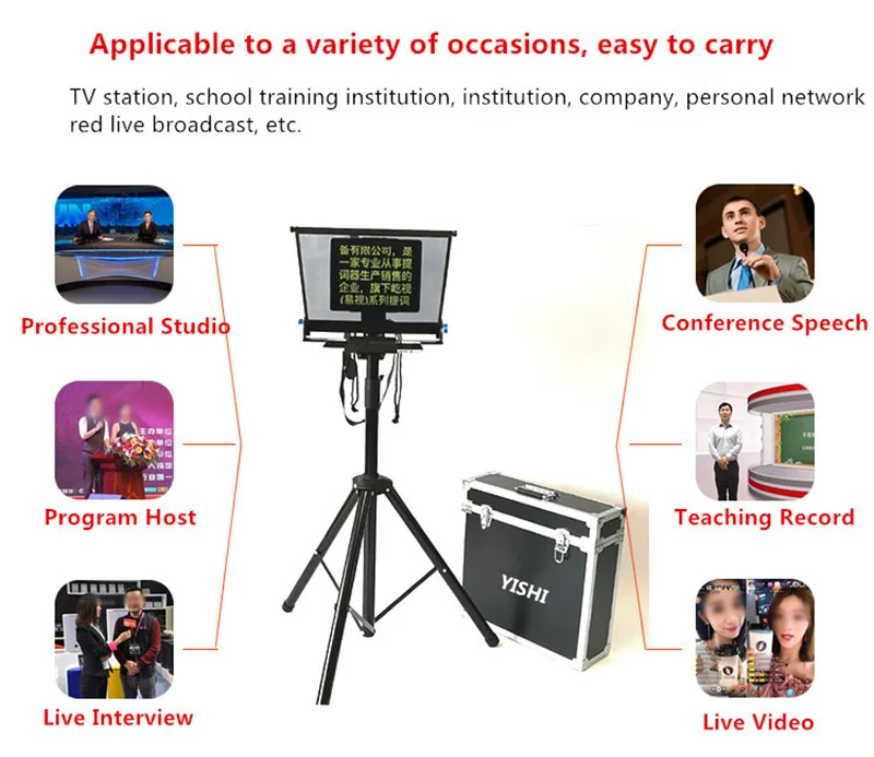 Название продукта: 22 дюйма, портативный интегрированный teleprompter Материал изделия: стекло + металл Модель продукта: YS-ZB22P, YS-ZB22PL Упаковка продукта: Заказная усовершенствованная воздушная коробка Область применения: Программное обеспечение текстового процессора Применимо к системе win7 win xp win10. Вы можете установить равномерную скорость прокрутки, размер и цвет. Различные узлы могут быть настроены для отображения различных цветов текст. Дистанция дистанционного управления: Беспроводное дистанционное управление на расстоянии 10-15 метров. Область применения: 1. Радио и телевизионные станции, школы, корпоративные организации, физические лица, сетевые красные якори и т. Д. 2. Надпись поддерживает камеры SLR, домашние камеры, небольшие DV-камеры, большие DV-камеры и другие модели. 3. Поддержка прямого входа VGA, HDMI, AV видео. Список продуктов: 1. Импортный Сверхтонкий разделитель луча-1 блок 2. Складные затемняющие Чехлы -- 1 комплект Выделенный зеркальный экран 3,22 дюйма-1 4. Переносная воздушная коробка-1 5. Беспроводное дистанционное управление-1 6. Цельный комплект-1 комплект 7. Специальные скобы-1 8. Удлините Кабель HDMI-1 с 9. Удлините корень питания-1 корень 10. Сопутствующие аксессуары-1 комплект 11. Профессиональный процессор, программное обеспечение-1 Набор