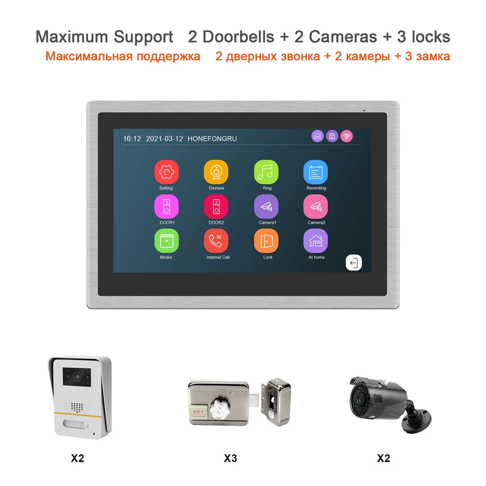 1. 10 дюймов полный сенсорный экран дисплея, поддержка 2 дверной звонок + 2 камеры, максимальная поддержка 128 Гб карта памяти