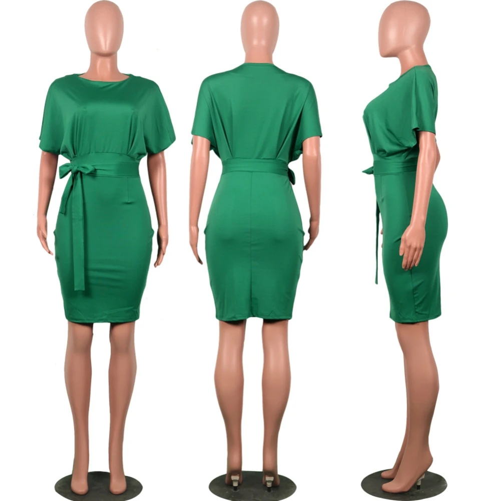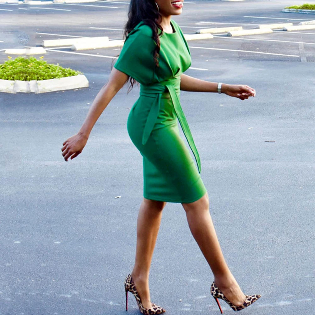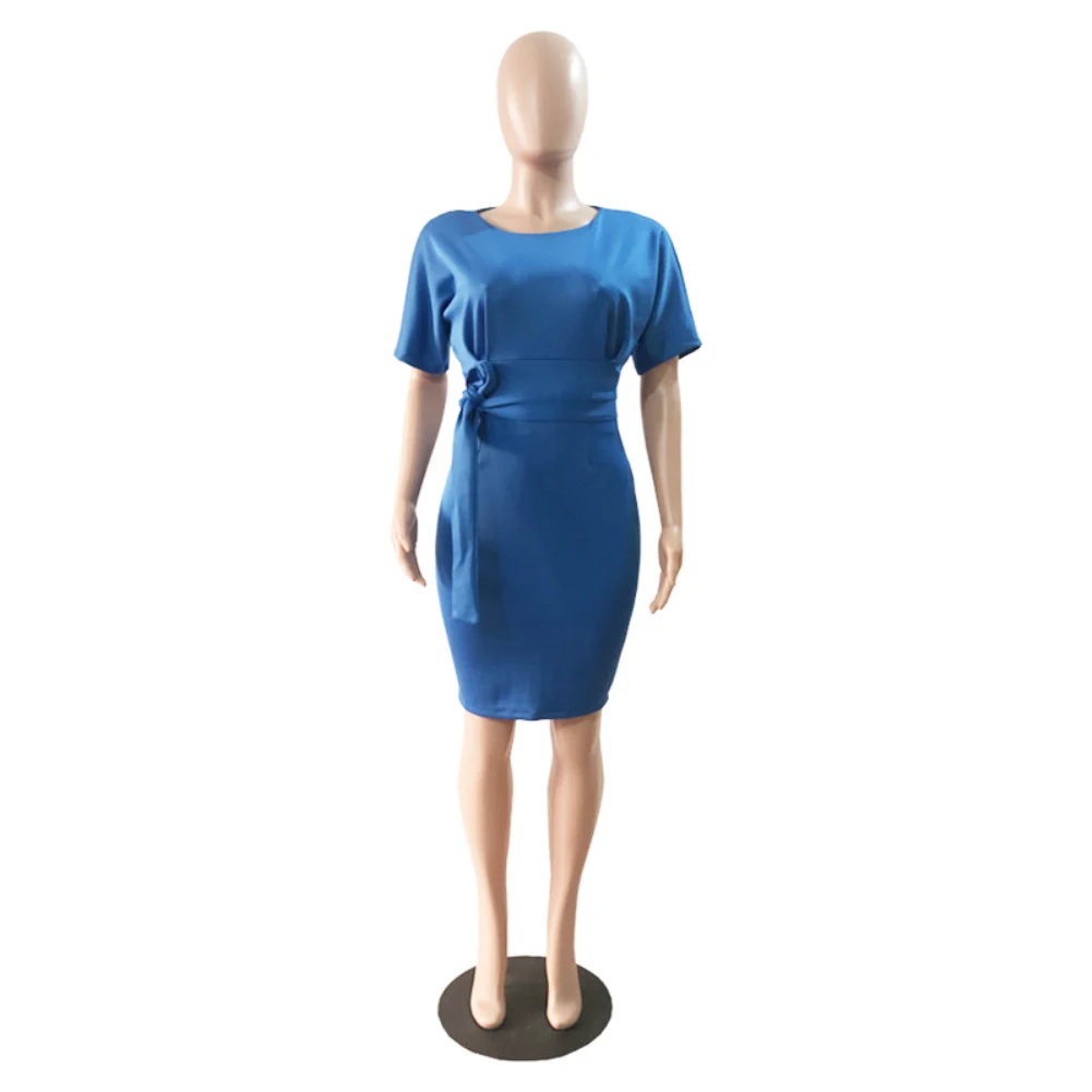Женское однотонное коктейльное платье до колена с коротким рукавом и круглым вырезом на поясе