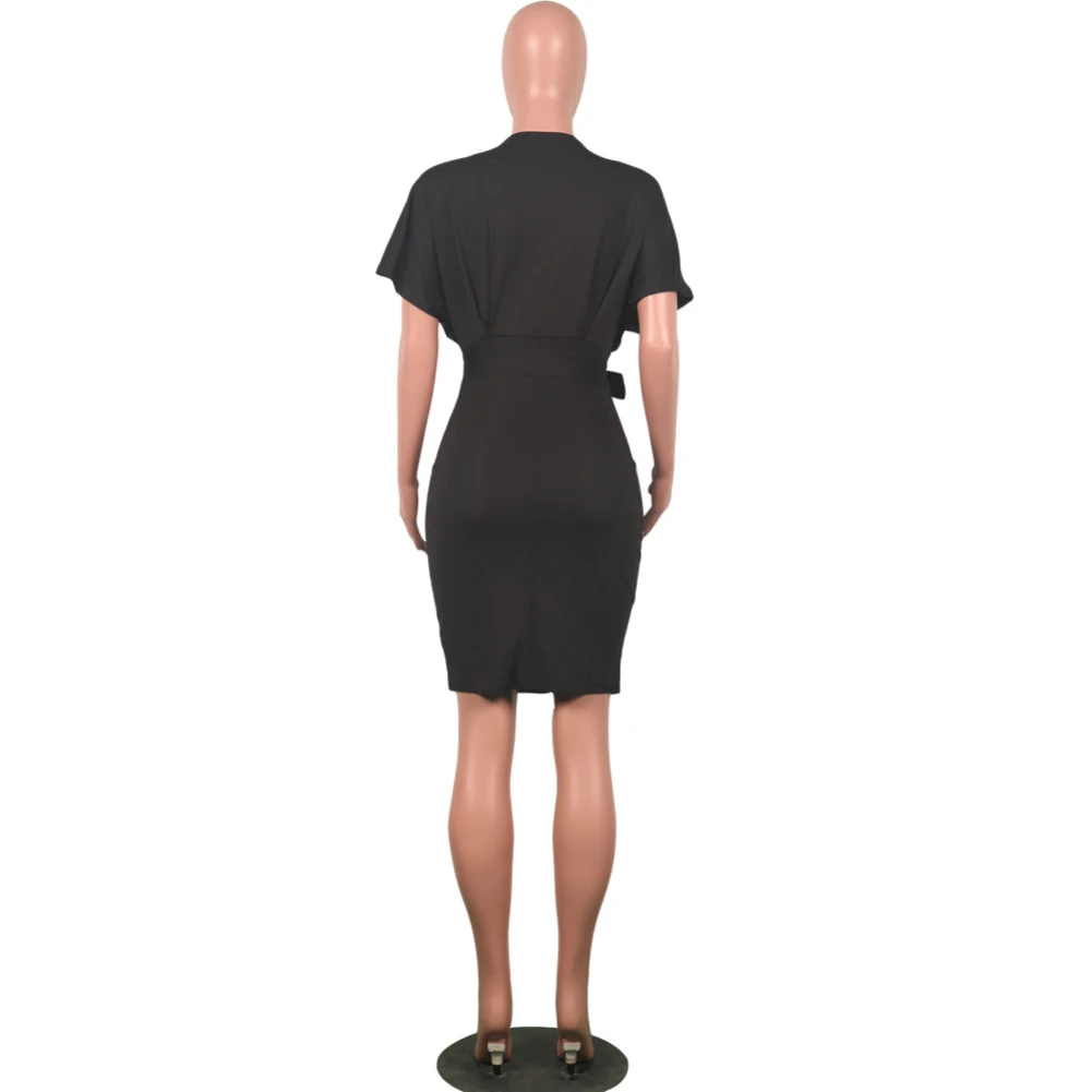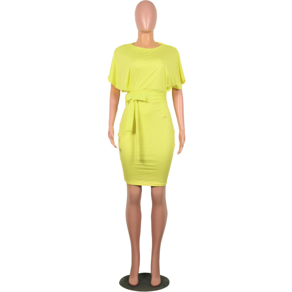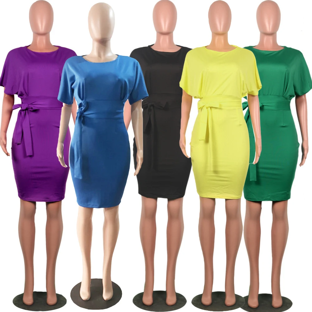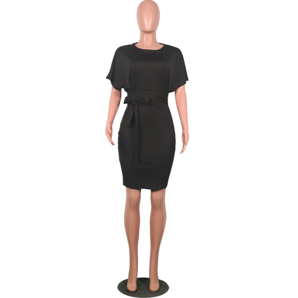 Женское однотонное коктейльное платье до колена с коротким рукавом и круглым вырезом на поясе