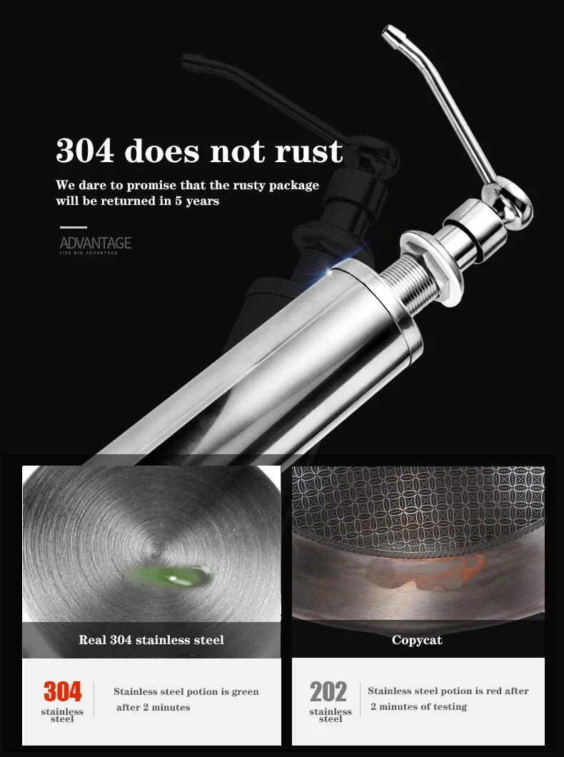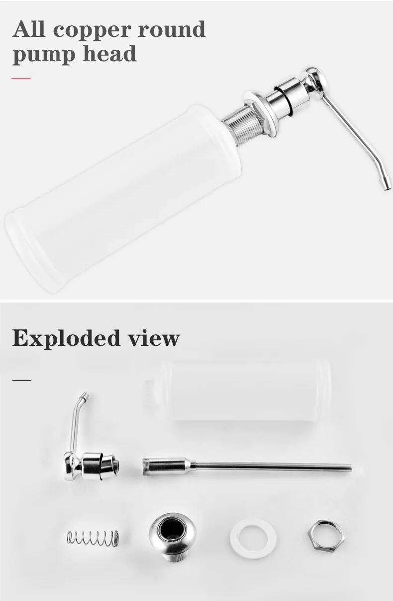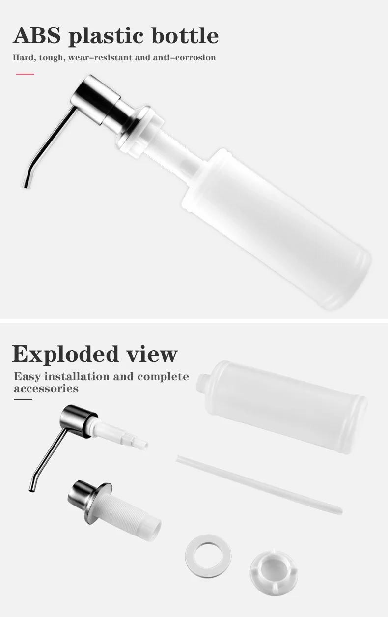 Особенности: Материал: АБС-пластик для головки и штифта, пластиковый насос, полипропиленовая бутылка, устойчивость к коррозии и кислотоустойчивость Применимый раковина: монтируемый диаметр отверстия (2,5-4,2 см); Монтируемый Толщина (2,6 см) Многократное использование: диспенсер для мойки мыла большой емкости (350 мл), длинная насадка, которая достигает над раковиной Простая установка: можно заправить жидким мылом-нужно скорее снять бутылку, это займет всего несколько минут, чтобы установить ее Можно использовать несколько раз, чтобы добавить оборудование для мыла, дезинфекции рук, шампуня, геля для душа, для любой домашней уборки, готовки