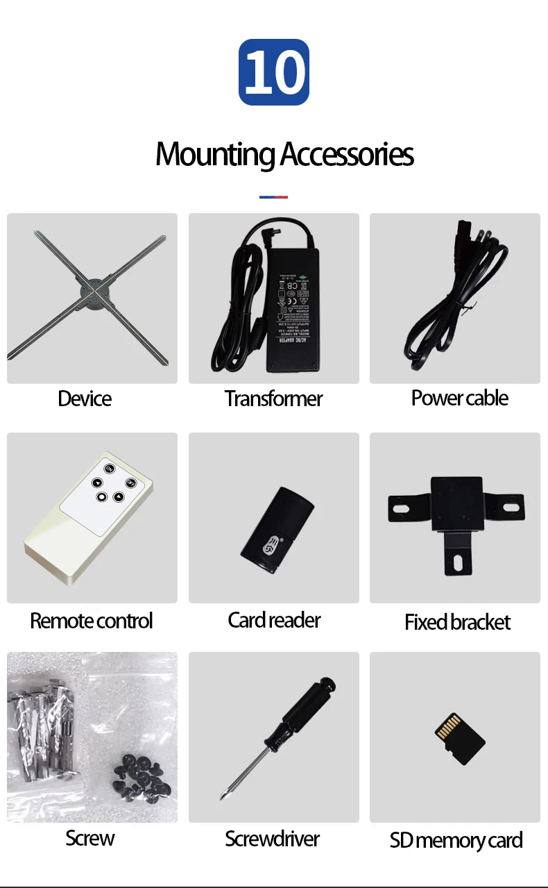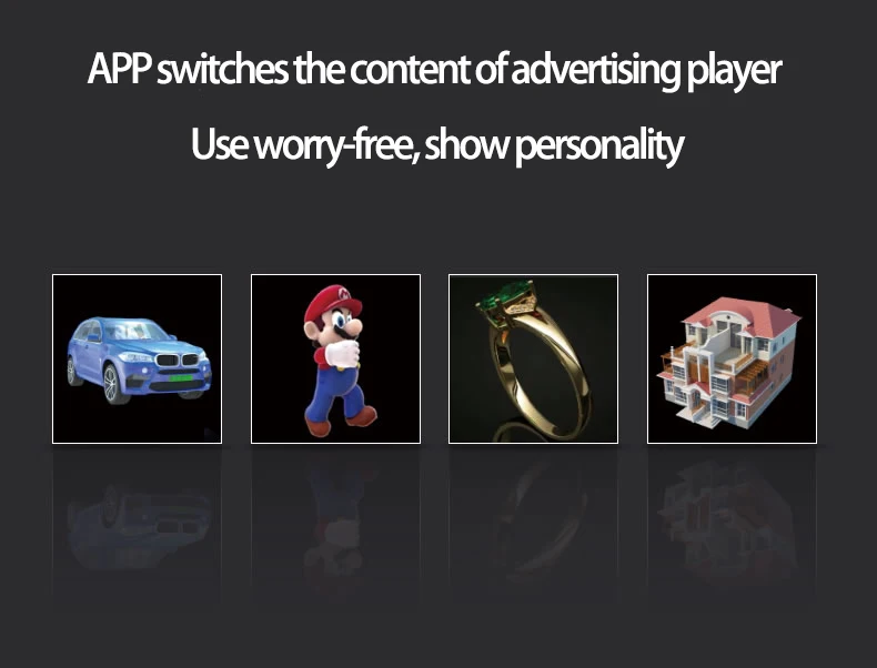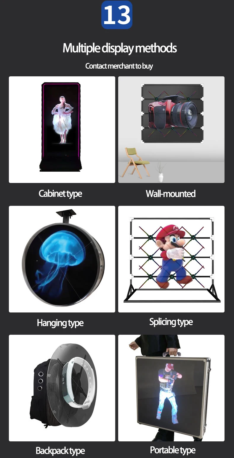 Особенности: ① 3D стерео, голограмма, повышают внимание, повышают визуальное воздействие 3D. ②Воспроизведение карты памяти или Wi-Fi, содержимое можно заменить на мобильный телефон ③ Малый размер, легко носить с собой, легко установить, широкий спектр вариантов использования. ④Изображение четкое, и его легко заменить рекламный контент. Он поддерживает обычные изображения, анимацию и изображение. Applicable применяется в кинотеатрах, аэропортах, торговых центрах, метро, городских рекламных объявлениях, дорожных знаках, выставках и других местах. Vivid яркий голографический дисплей продукта, динамический дисплей деталей продукта легко определить, подходит для информации о продукте подсказок и приложений.