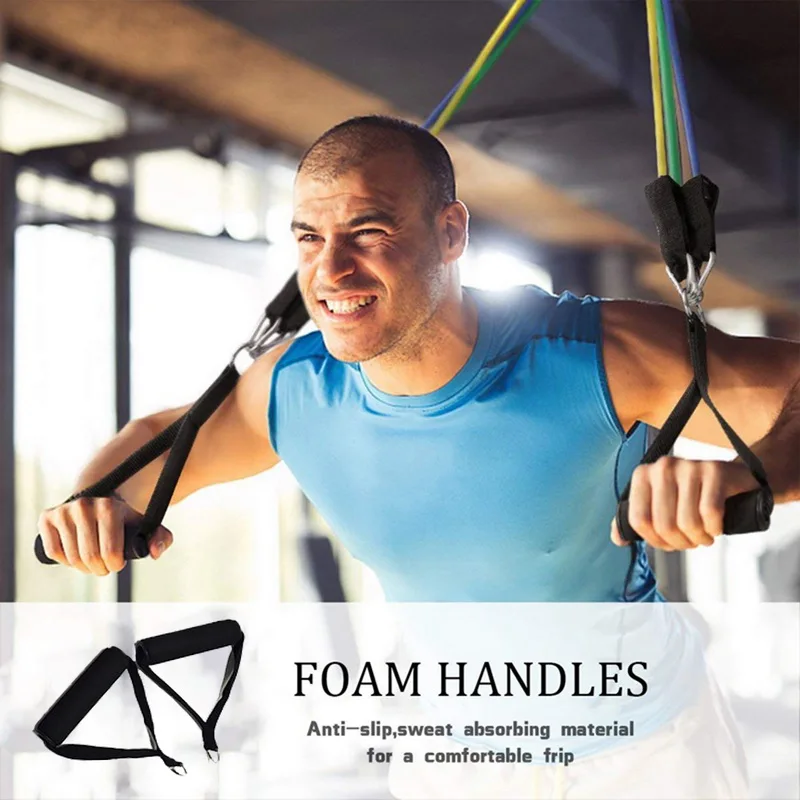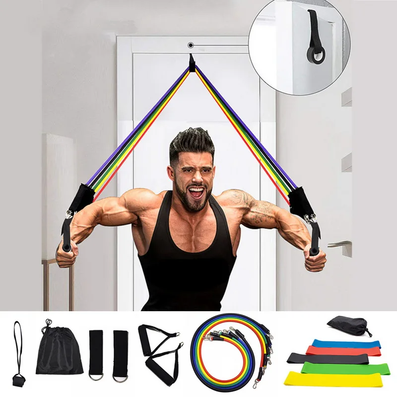 Посылка включает в себя: 17 шт./компл. (Натяжная веревка * 5 + ручка из пены * 2 + Защитная дверная Пряжка * 1 + металлический штатив * 2 + 600*50*0,35 мм (зеленый, синий, желтый, красный, черный) латексное Натяжное кольцо * 5 + сумка для хранения * 2)