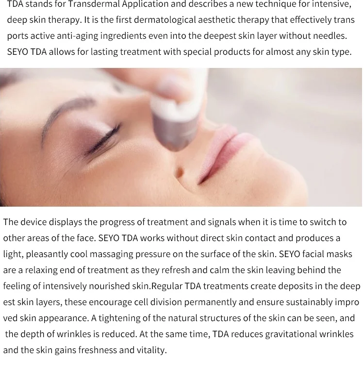 ТДА выступает за трансдермальное применение и описывает новую технику для интенсивной, глубокой терапии кожи. Это первая дерматологическая Эстетическая терапия, которая эффективно переносит активные Антивозрастные ингредиенты даже в самый глубокий слой кожи без игл. Видеть вас TDA позволяет длительное лечение с помощью специальных продуктов для практически любого типа кожи. Лечение начинается после очищения лица с помощью дермабразии для клеток SEE YOU. Во время этого процесса омертвевшие клетки кожи удаляются мягко и эффективно. Клеточная дермабразия поддерживает поглощение активных ингредиентов TDA (например, гиалуроновые комплексы) и активирует клетки, формирующие коллаген. См., что ваша клетка подготовит кожу для глубокого лечения TDA, это плотно ориентировано на различные слои кожи. Аппликатор TDA ориентируется на определенное расстояние над участками кожи, которые должны быть обработаны.