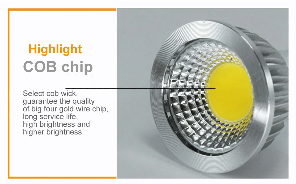 Технические характеристики: * Тип цоколя: G5.3/GU10/E14/E27 * Напряжение: 110 В ~ 240 В * Поддержка диммера: да или нет (вы можете выбрать!) * Материал корпуса: прочный, термостойкий, огнестойкий материал, алюминиевый корпус * Светодиодный чип: Cob * Светодиодный чип, Количество: 1 шт. * Угол луча (°): 60 ° * CRI: >80 * (Чип на плате) Срок службы: 50000 часов * Сертификаты: CE, ROHS, CCC * Светильник Цвет: теплый белый (2700-3500K); Холодный белый (6000-6500K) Особенности: * Ультра-Яркий Светодиодный точечный светильник. * Безопасный и эффективный. Лучший энергосбережения, низкое тепловыделение и нижняя потребеление энергии. * Вы можете отрегулировать светильник и выбрать наиболее подходящий светильник. * Длительный срок службы, высокая светоотдача. * Большое уменьшение выбросов углерода, экологически чистый. * Твердотельный, ударопрочный. Прочное термостойкое стекло. * Без VU и ИК-излучения. Не содержит свинца, ртуть и другие элементы загрязнения. * Подходит для домашнего использования, офиса, магазина, ресторана, выставок, залов, музейных отелей. Посылка: * 1*1 шт. точечный светильник