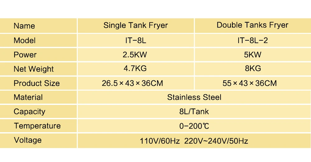 Описание: Тип: электрическая фритюрница 8л/16л Модель: IT-8L/IT-16L Напряжение: 220 ~ 240 В/50 Гц, Мощность: 2500W Материал: Нержавеющая сталь Capicity: 8 л/16 л Тип: Одноместный/двойной бак Температура: 0-200 ℃ Особенности: 1. 3 кольца 6 нагревательных трубок: быстрый и равномерный нагрев, Высокая энергоэффективность 2. Датчик контроля температуры: датчик контроля температуры масла, нулевая ошибка, чувствительная чувствительность, точный контроль температуры (0-200 ° C), вкусная еда 3. Толстый материал из нержавеющей стали, изоляция более стабильная, более термостойкая и прочная 4. Расширяющаяся Съемная корзинка для фильтрации масла ecess, легко моется Упаковочный лист: 1 * фритюрница с двумя решетками машина 1 * фритюрница с двумя решетками крышка 1 * Инструкция