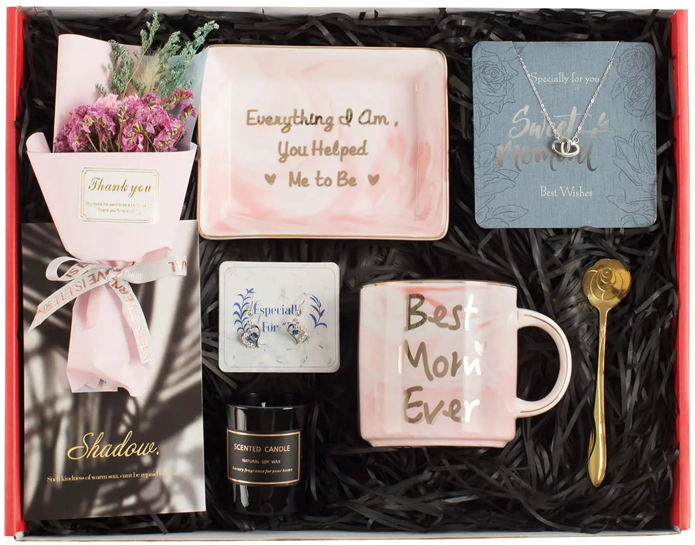 Подарочный набор для мамы🎁-Розовая мраморная кружка «Best Mom Ever» и Золотая ложка, розовые мраморные ювелирные лотки с ожерельем из стерлингового серебра 925 пробы и парой серег, ароматической свечей и кучей гвоздиков. В комплекте с милой коробкой и подарочной картой. День матери Подарки для мамы от дочери-идеальный подарок для сказочных людей в вашей жизни! Индивидуальная Подарочная коробка, которая обязательно улыбнется. Подарки на день матери для жены-все подарки прекрасно сочетаются, вашей маме понравится. Тяжелая коробка с очень милой и отличной презентацией. День матери подарочный набор готов-наша Подарочная коробка предназначена для обеспечения лучшего опыта. Нет необходимости переупаковывать. Лучшее соотношение цены и качества-если у вас возникли какие-либо проблемы, просто напишите нам по электронной почте! Мы здесь, чтобы удовлетворить наших клиентов.