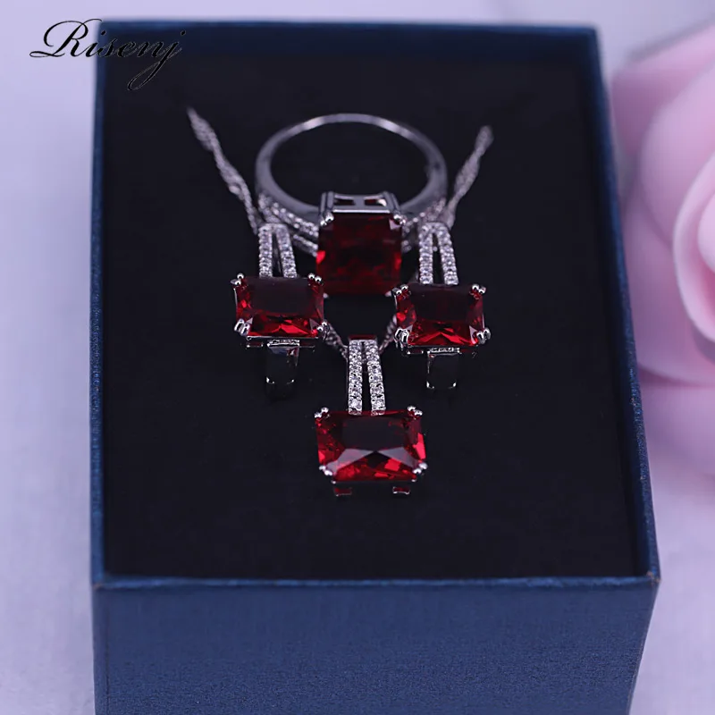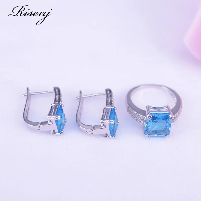 Продвижение Дубай Стиль 925 стерлингового серебра квадратный голубой CZ & кольцо с австрийскими кристаллами серьги кольцо Ожерелье Набор Свадебные украшения