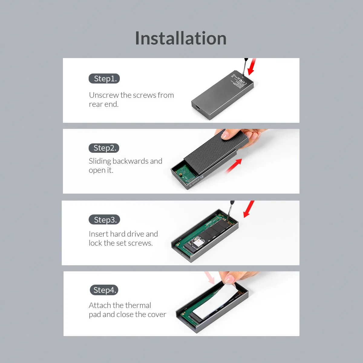1.Thunderbolt 3 SSD Enclosure 2.40Gbps Thunderbolt 3 C to C Cable 3.Screws 4.Silicone thermal pad 5.Screwdriver 6.User Manual/Thanks Card 7.Packaging Box