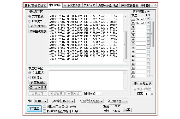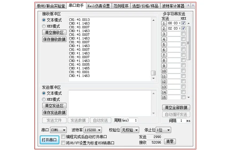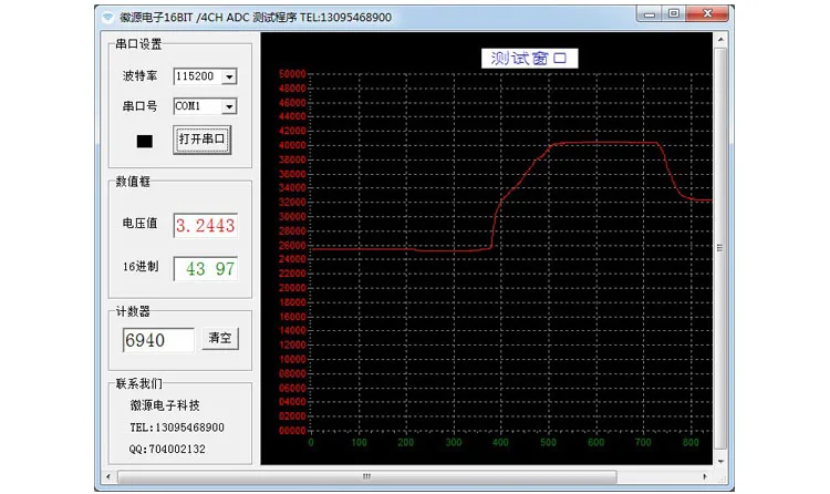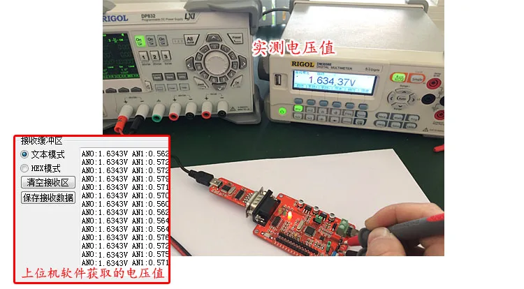 Постоянно собирает 4-канальный аналогового напряжения для 16-бит преобразования АЦП и рассчитать преобразования данных в качестве значения напряжения и послает данные передаются через последовательный порт в виде кода ASCII. В этом режиме программное обеспечение serial port assistant также может считывать напряжение напрямую, подходит для проектов быстрого развития, потому что пользователям не нужно подробно понимать рабочий процесс оборудования с одним чипом.