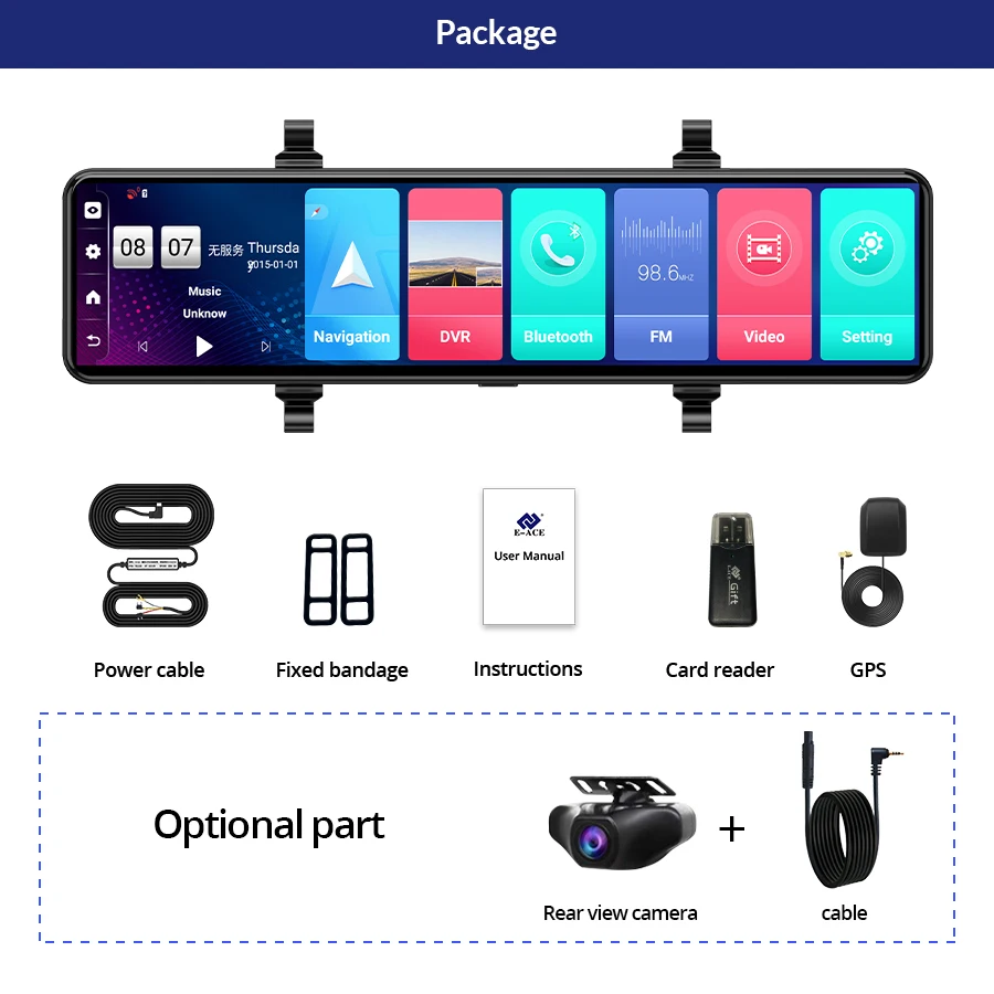 -1 x DVR(Without Rearview Camera) -1 x User Manual -2 x Bandage -1 x USB Card Reader (Gift) -1 x Buck Line For 24H Parking Monitoring -1 x GPS Module